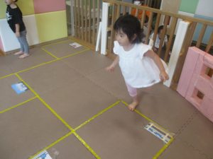 0歳児クラスから2歳児クラスのお友達までみんなで一緒に、室内にてサーキット遊びを楽しみました。