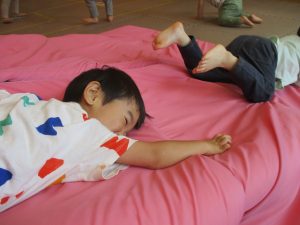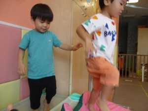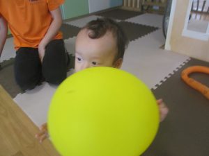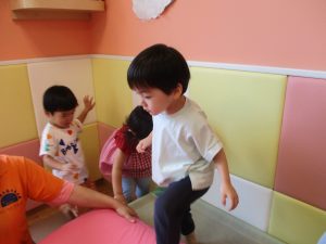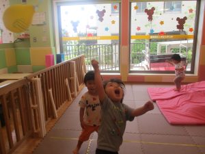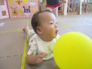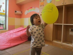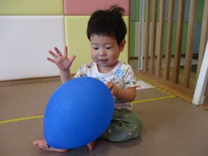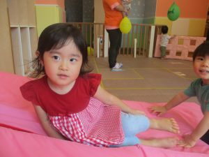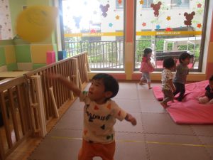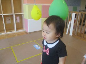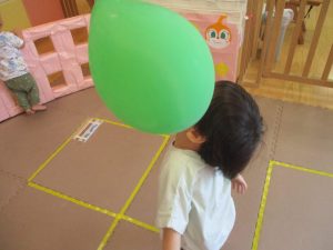 先生たちがマットのお山や吊るし風船を設置し、みんなで体を動かして遊んでおりました。
