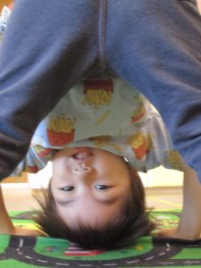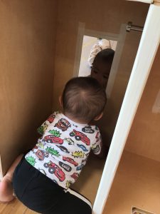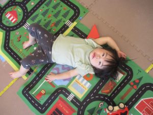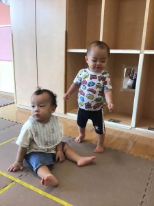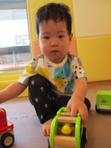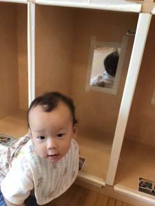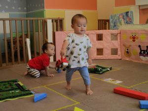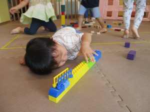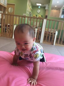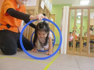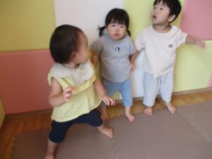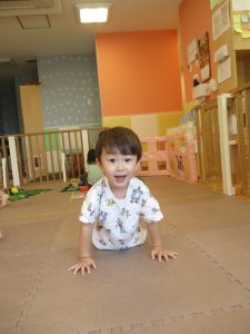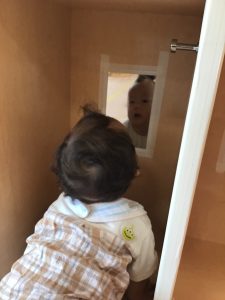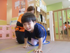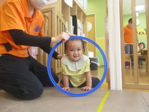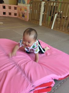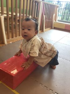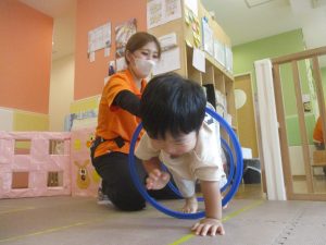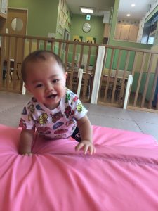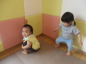 室内ではマットを組み合わせたサーキット遊びを行いましたが、力強くマットの上を移動したり室内に設置してある鏡を見ては「ニコッ」とほほ笑んでいる姿が印象的でした。