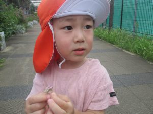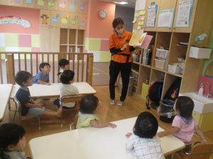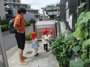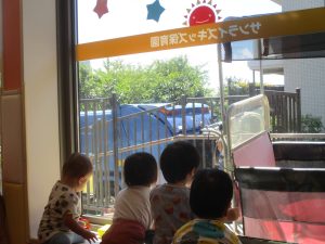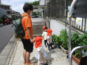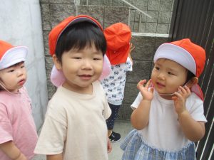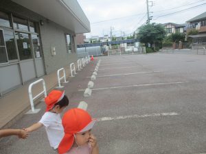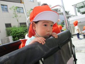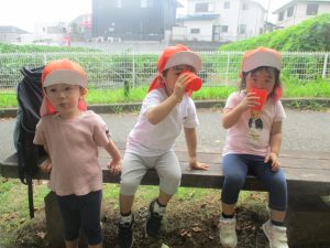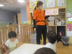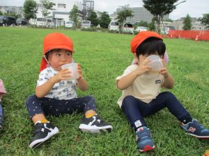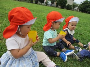 皆で水分補給をした後は消防署の前で消防車や救急車をじーっと見つめては、目を輝かせながら保育園に戻りました♪