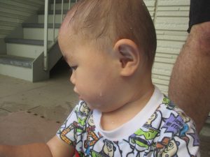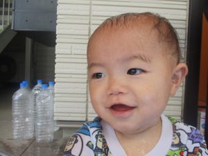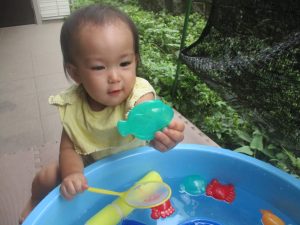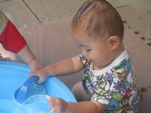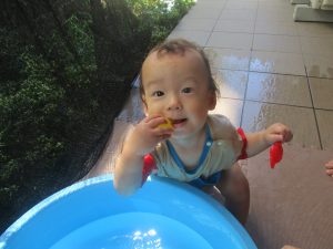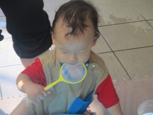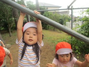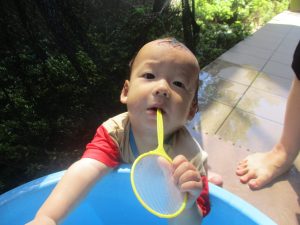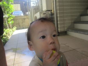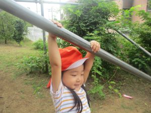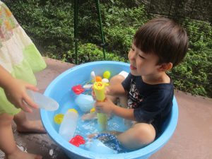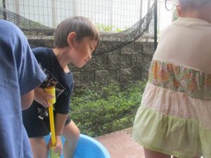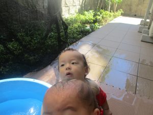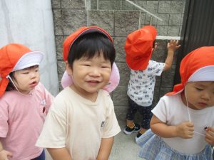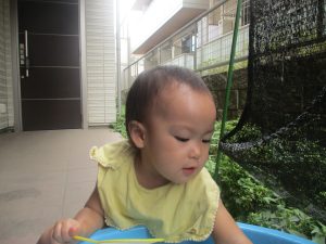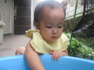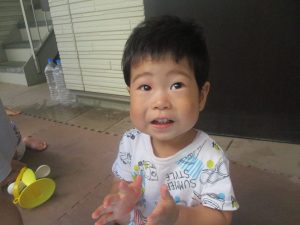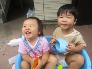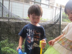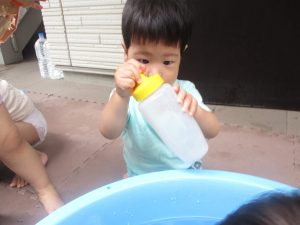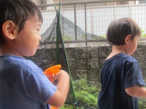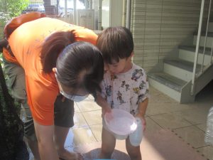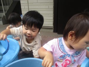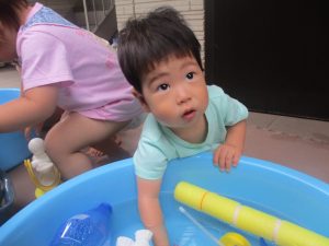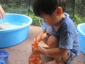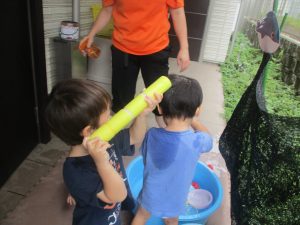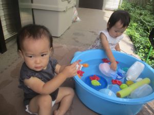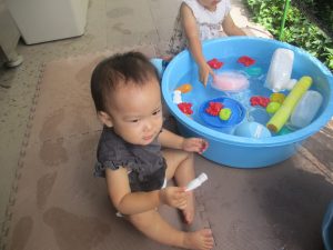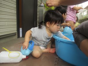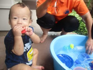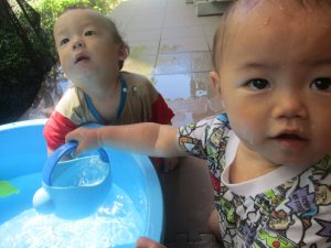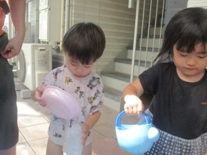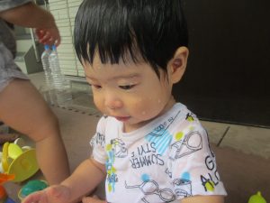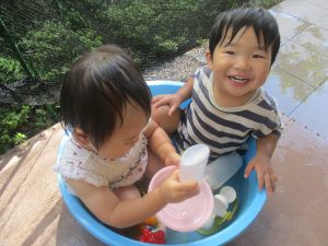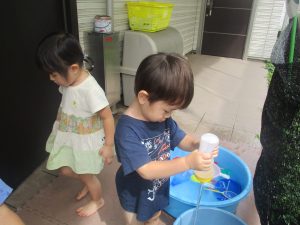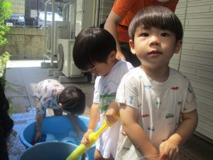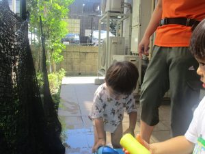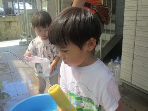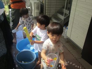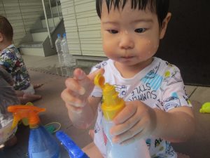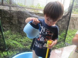 今日もジメジメとした気温で汗が出てくるお天気でしたので「気持ちがいい♪」と水で汗を流して遊びました。