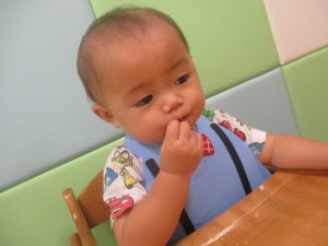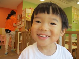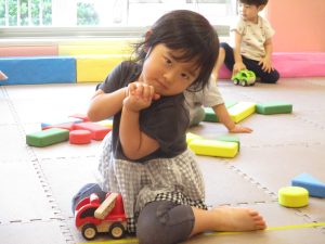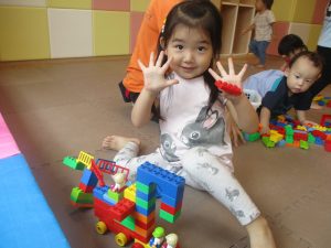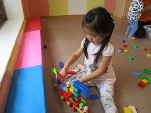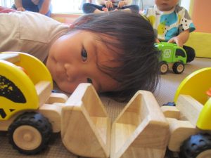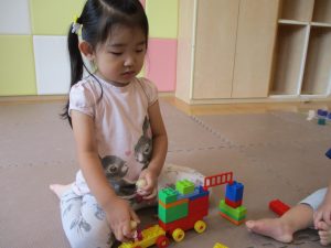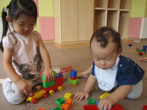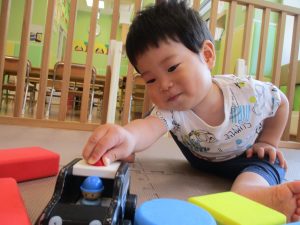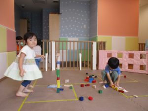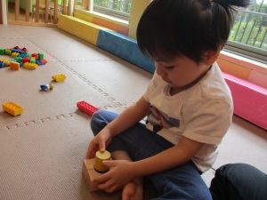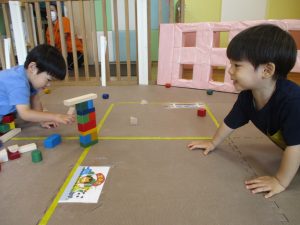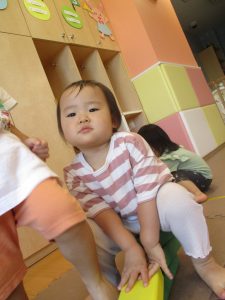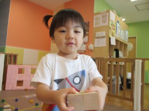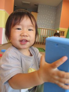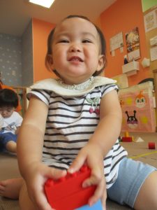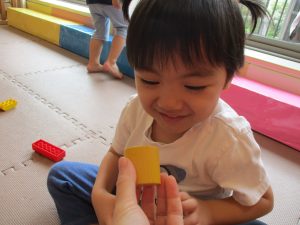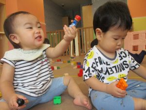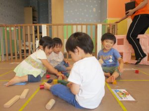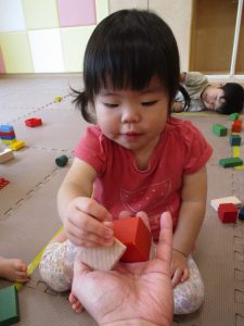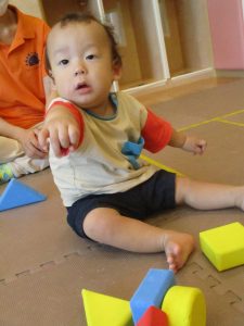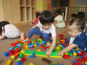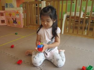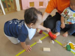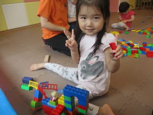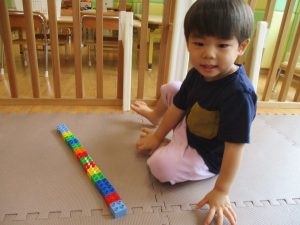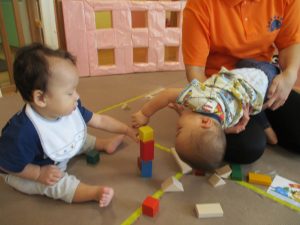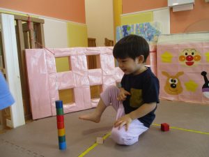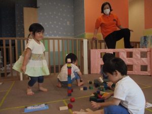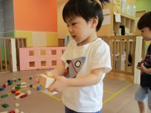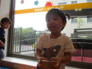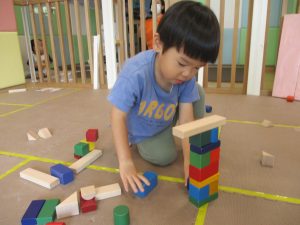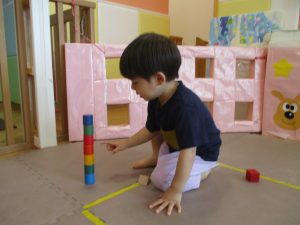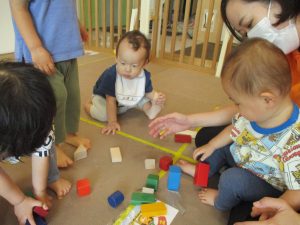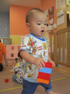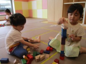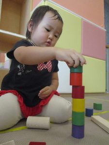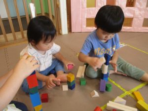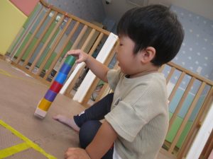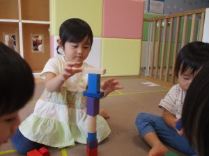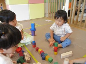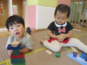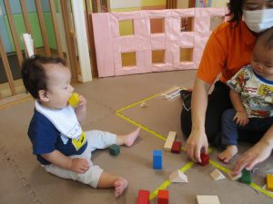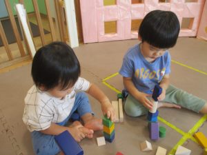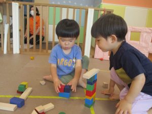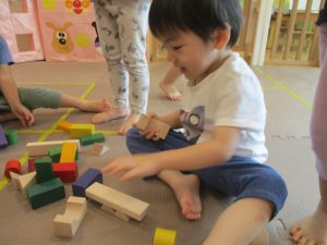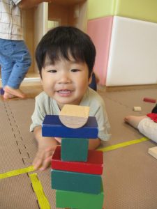 2歳児クラスのお友達を真似して、小さいお友達も積み木を積み重ねて、できた時には一緒に拍手をして喜んだり、積み上げた積み木を倒す遊びを繰り返したりして楽しんでおりました。