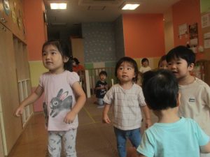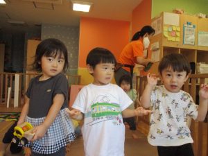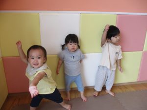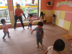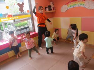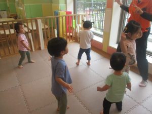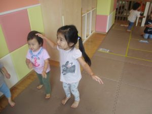 体操の音楽が流れだすと、1歳児クラスのお友達もノリノリに動き出しています♪