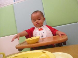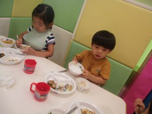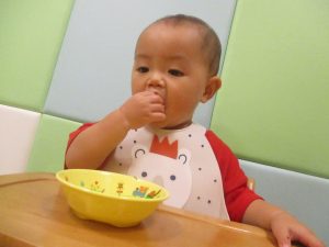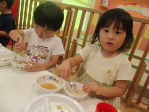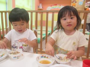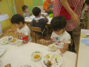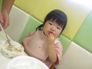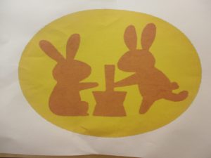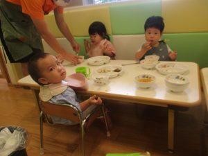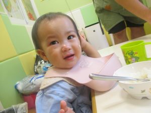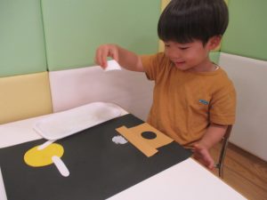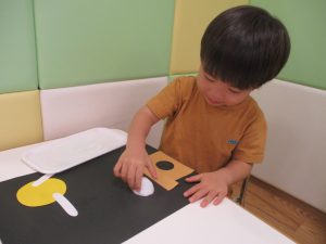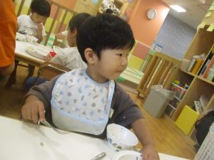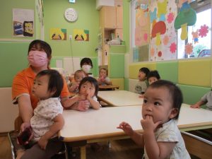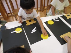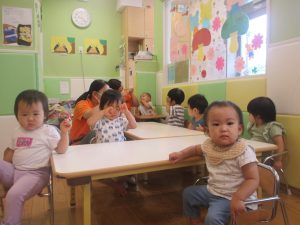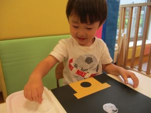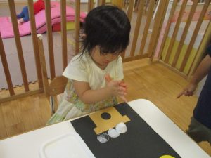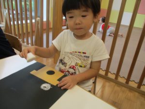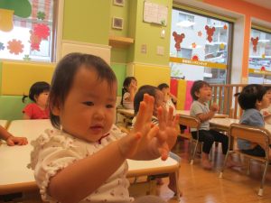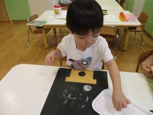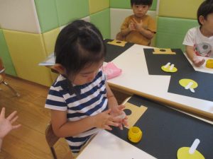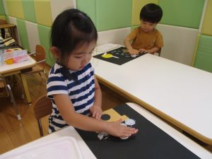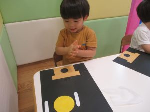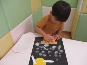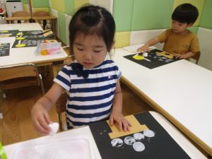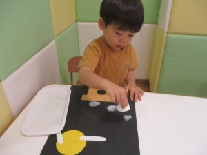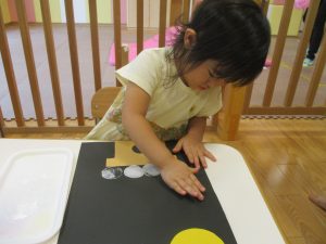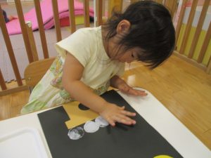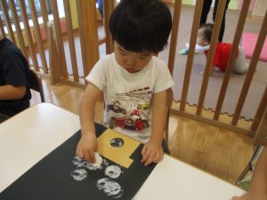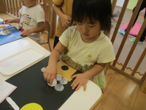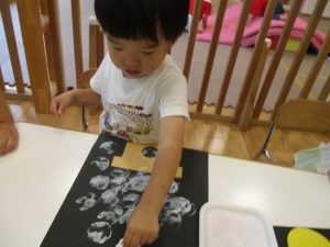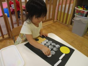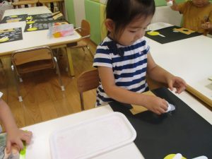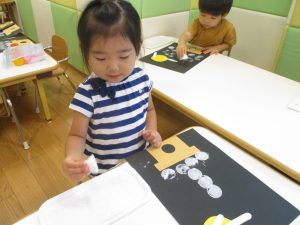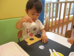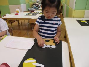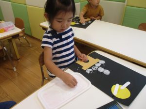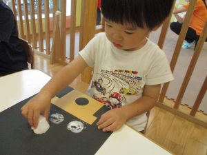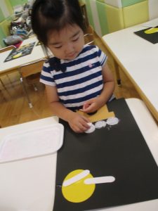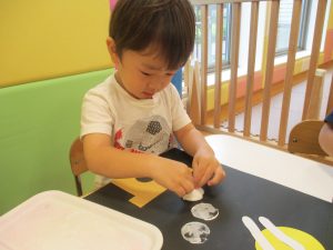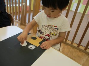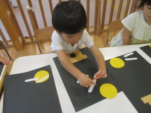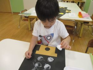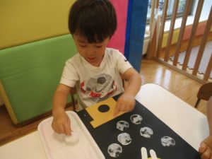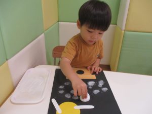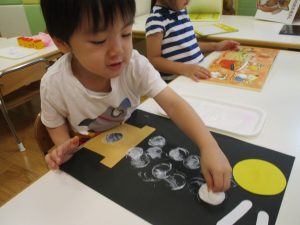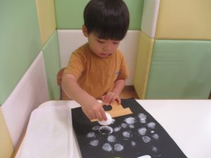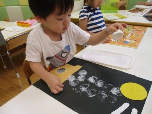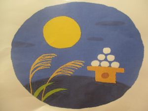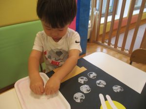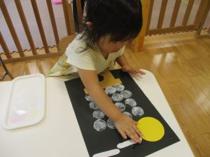 その他にも、全クラスお月見の製作(スポンジスタンプを使ってのお団子製作遊び)を行ったり、「お月様の中にうさぎさんが住んでいるんだよ~」とお話をしながらお月見の「うさぎ」の歌を歌ったりしました。