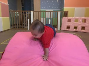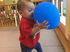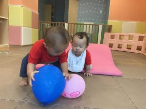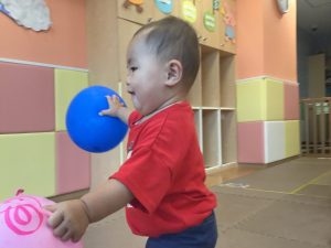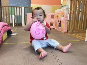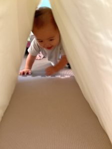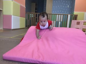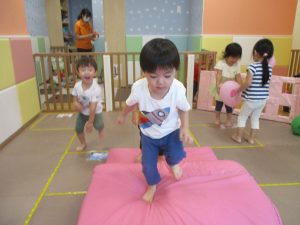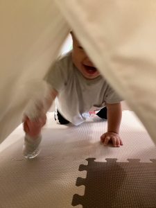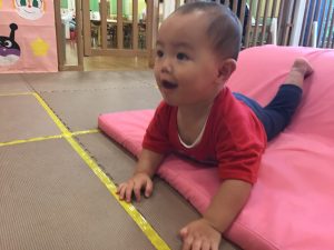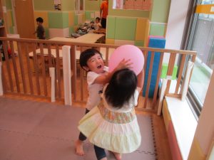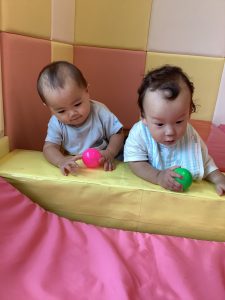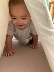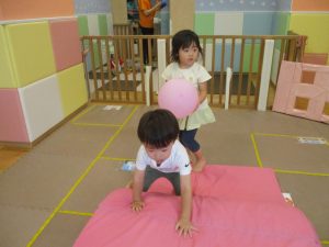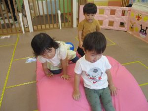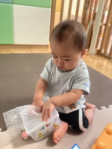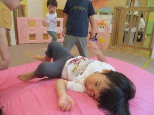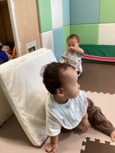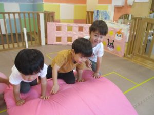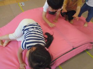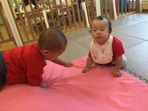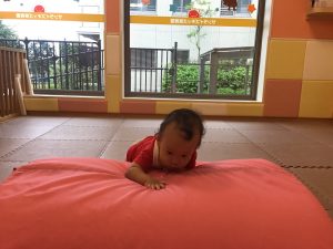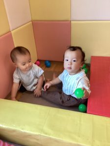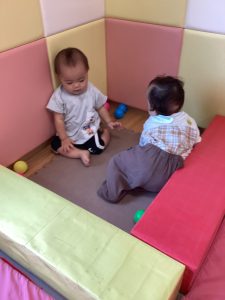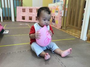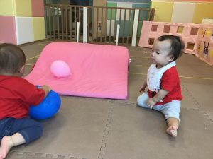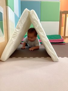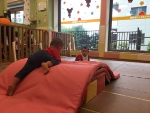 0歳児クラスのお友達は、お部屋で大好きな先生と一緒にお布団のトンネルやミニボールプールを作って遊んでおりました。