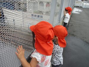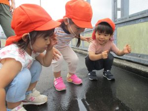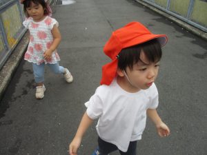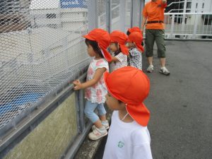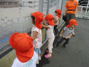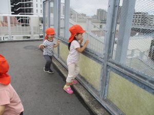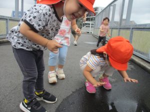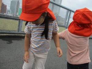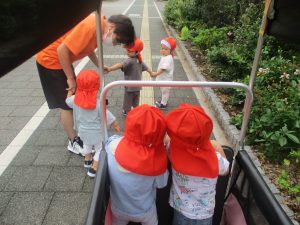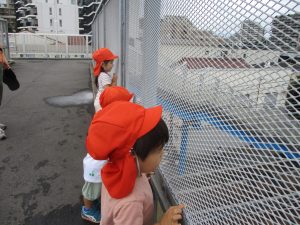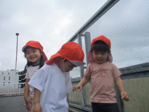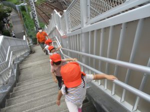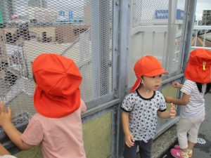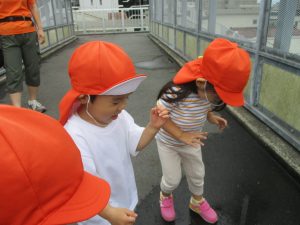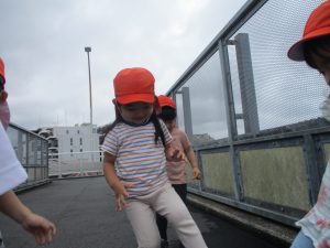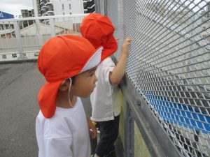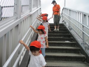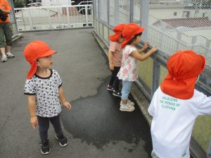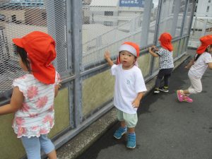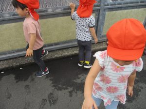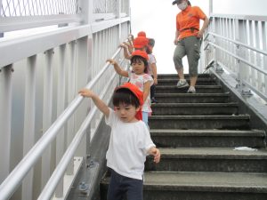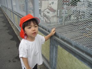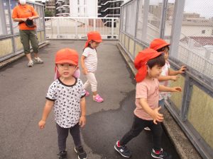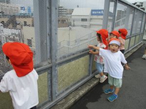 2歳児クラスのお友達は、みんなの大好きな”電車”を見るために、駅周辺の陸橋までおでかけをしました。