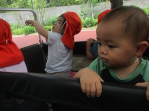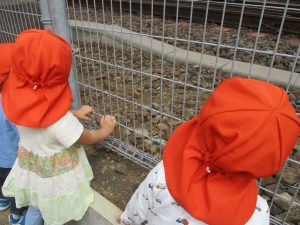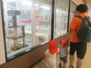 0、1歳児クラスのお友達は、園周辺の景色を楽しみながら近隣のモールに出かけました。大好きな犬や猫ちゃんをガラス越しに見て、ニコニコと笑顔を見せておりました。