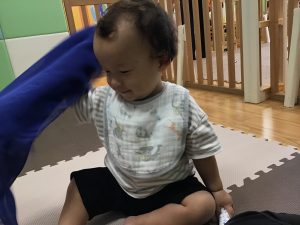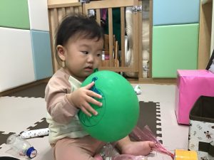 カラカラと音のなる手作り玩具でいろいろな音を楽しんだり、柔らかい布の玩具や風船の感触を味わったりして過ごしておりました。