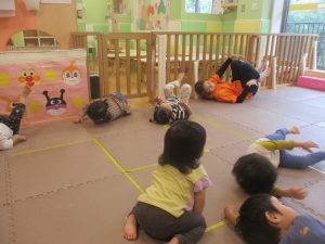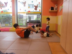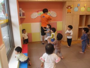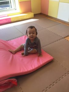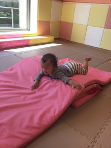 マットのお山はお子様達にもとても好評で、大好きな先生に向かってハイハイをしながら進んだり、お山の上で「ごろりん♪」と気持ちよさそうに休憩をしたりする姿が見られております♪