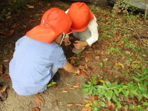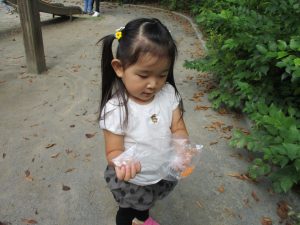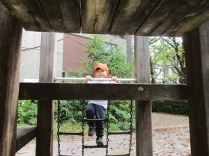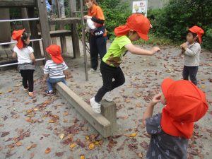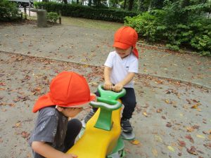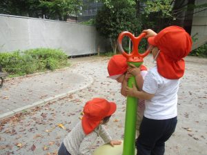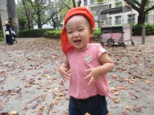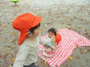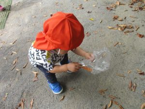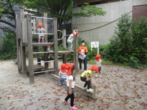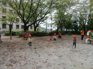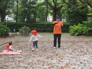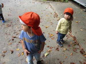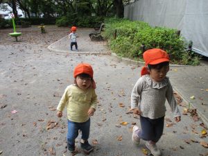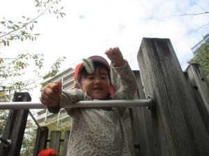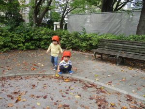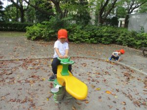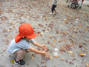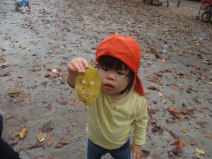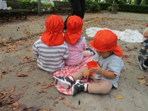 さくら公園では、新しいお友達を含めた小さいクラスの友だちと大きいクラスのお友達がみんなで賑やかに遊具を使って体を動かしたり、先生と一緒に落ち葉を集めてちぎったり秋のお花や虫探しをしたりして過ごしておりました♪