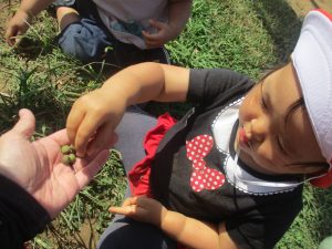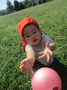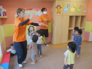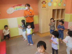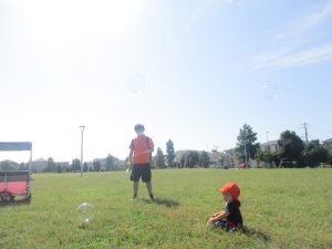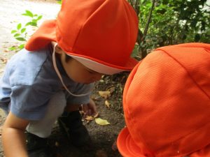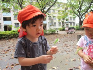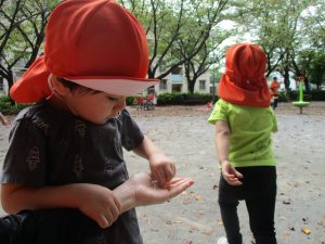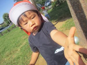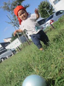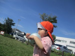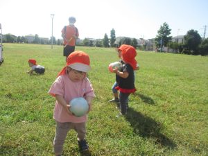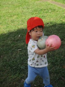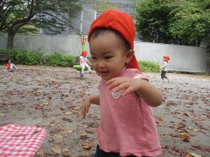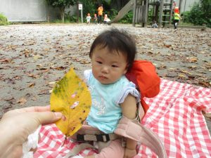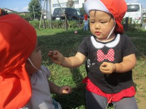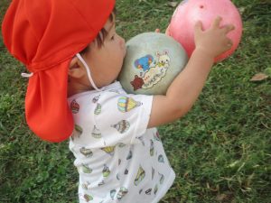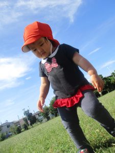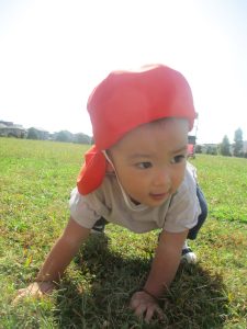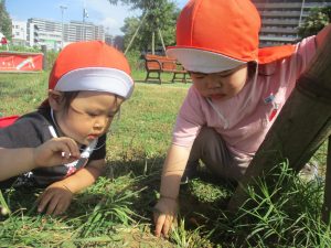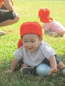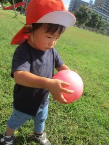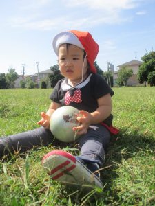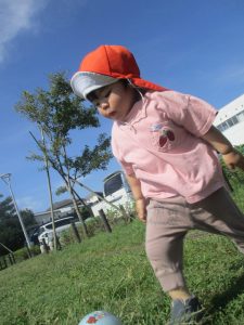 とても気持ちの良いお天気となり、先生と一緒にボールを追いかけて走り回ったり、芝生の上に転がりながら地面を歩く虫さんや葉っぱに興味を持ったりする姿も見られました♪