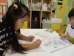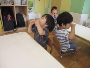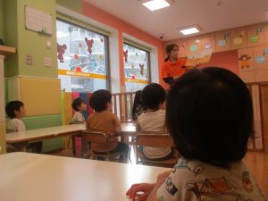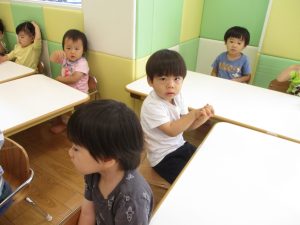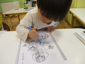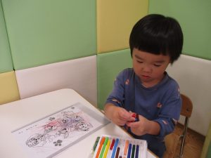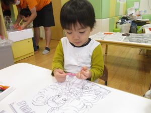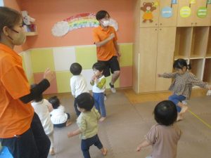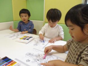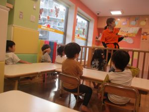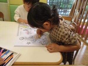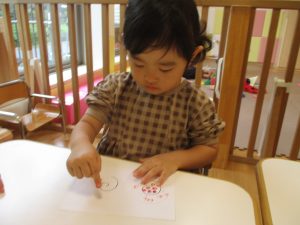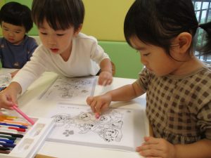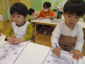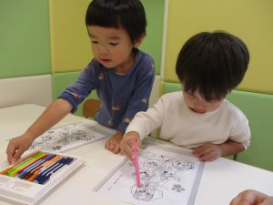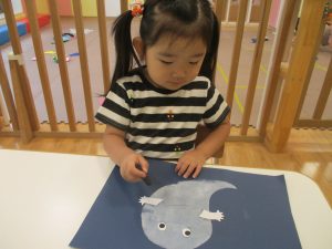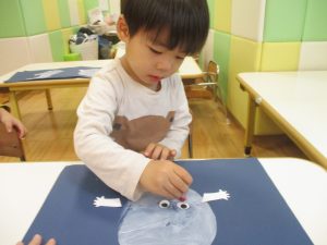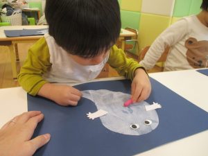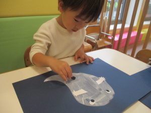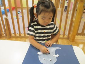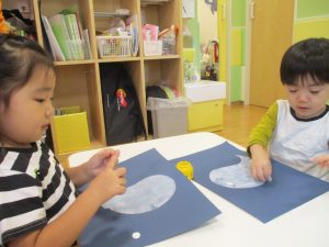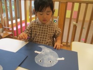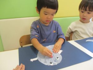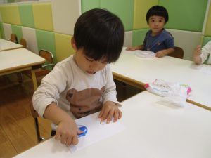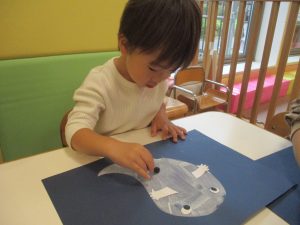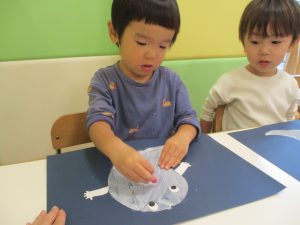 2歳児クラスのお友達は、室内にて10月の製作を行いました。