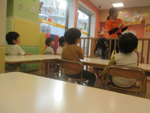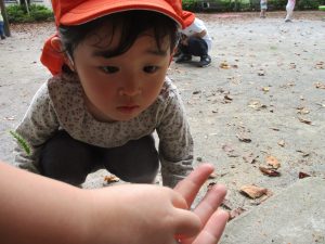どんぐりのころちゃんが、「どんぐりころちゃん あたまはとんがって おしりはぺっちゃんこ どんぐりはちくりしょ♪」と歌いながら歩いて行くと…どんぐりの仲間や栗などいろいろなどんぐりさんに出会っていきます。絵本の中にはダンゴムシや、トンボ、バッタなど秋の虫たちもかくれんぼをしており、「ダンゴムシさんがいたよ!」とお子様達も目をキラキラさせながら見ております。