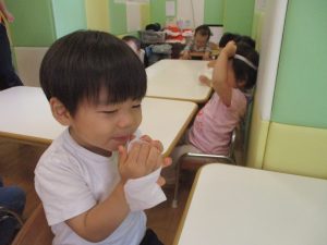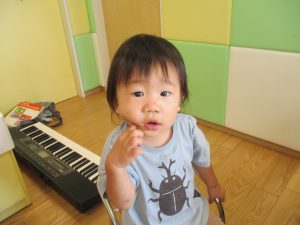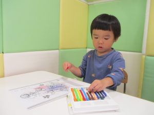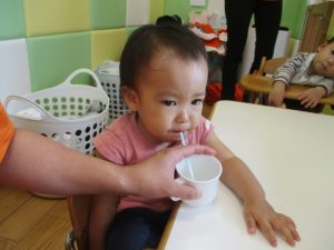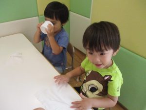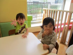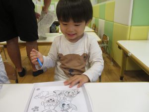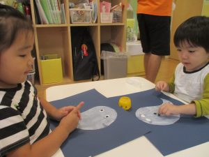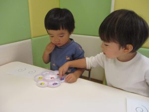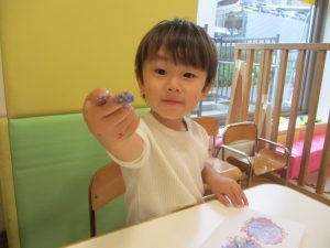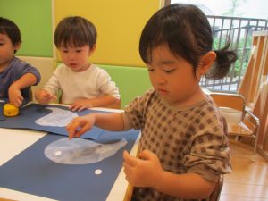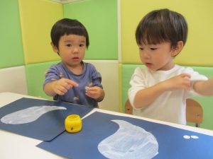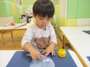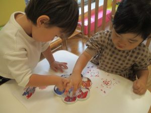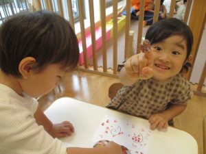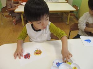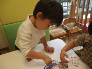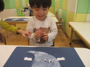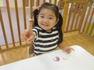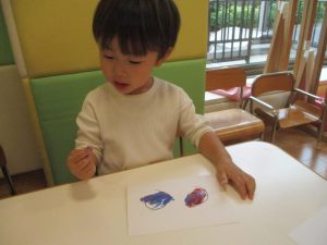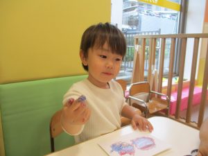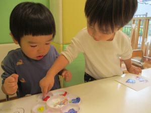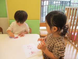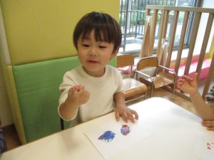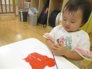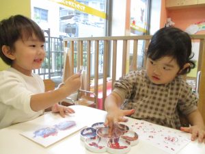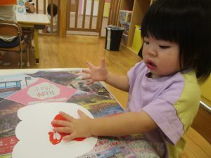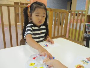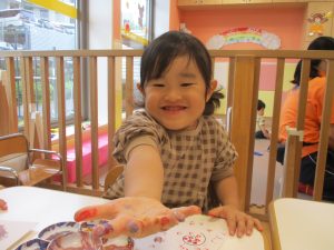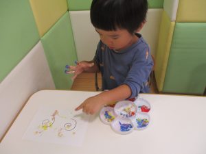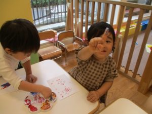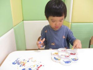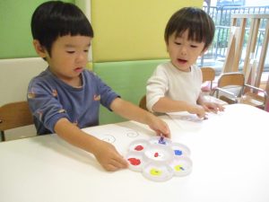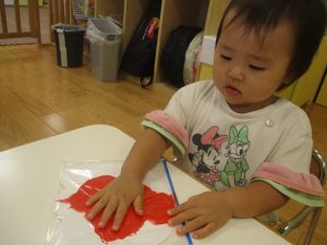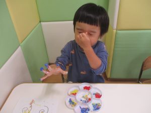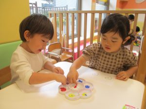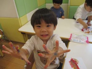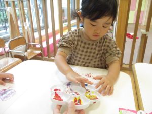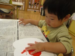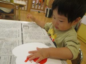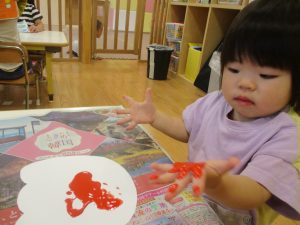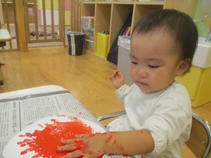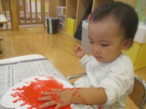 先生と一緒に一人ずつ順番に絵の具に触れての遊びを楽しみました。