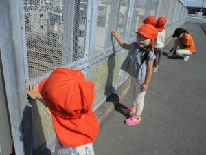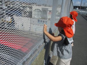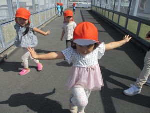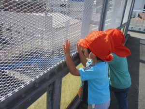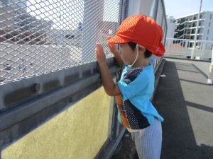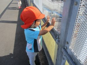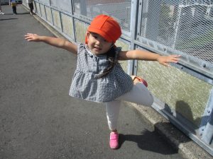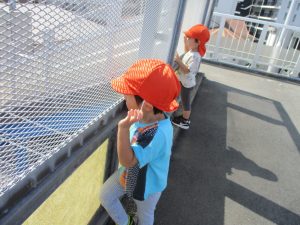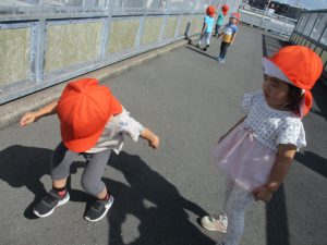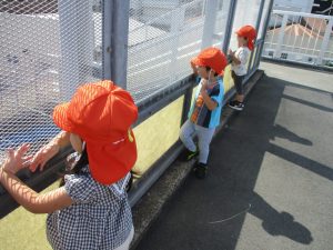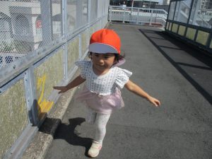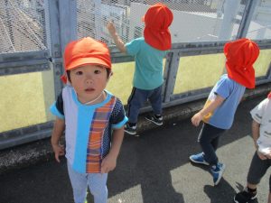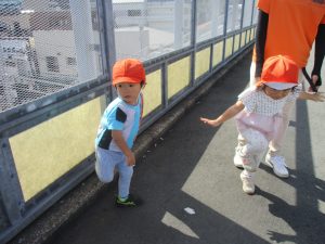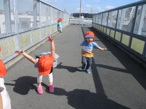そして陸橋に登ると、お子様達の大好きな成田エクスプレスやしおさいなどたくさんの電車だけでなく、飛行機や色づき始めた木々なども見ることができ、みんなで「飛行機ポーズ♪」と両手を広げたり、「葉っぱが赤くなってるね!秋だね~♪」といろいろな景色を楽しむことができました。