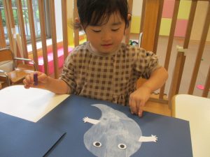「ハッピーハロウィン!」とハロウィンを楽しみにしながら絵の具やのりを使っての製作に取り組んでおりました♪