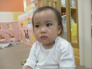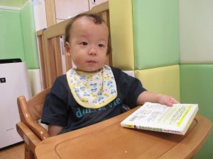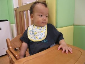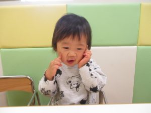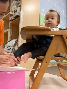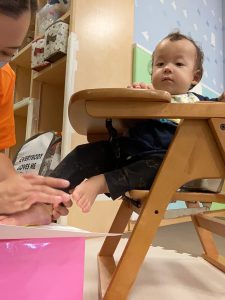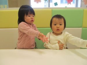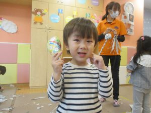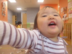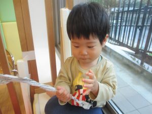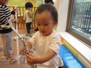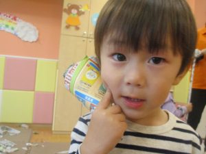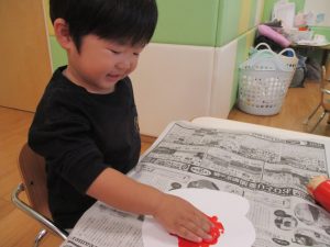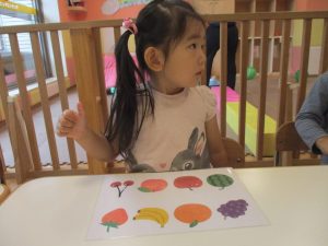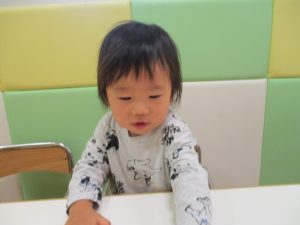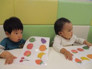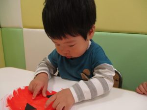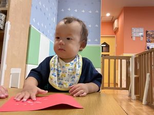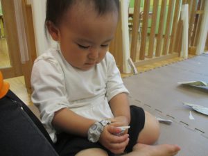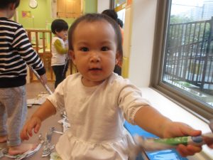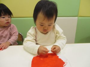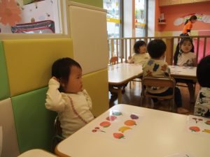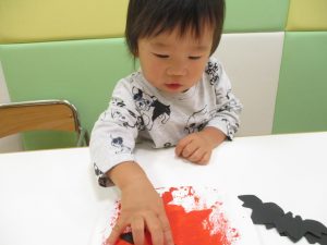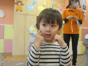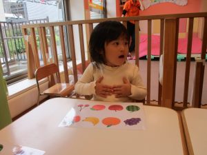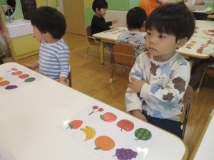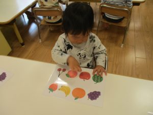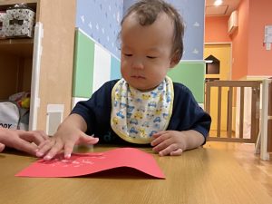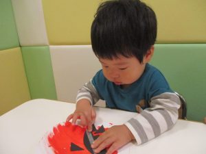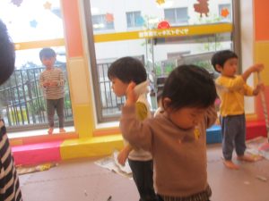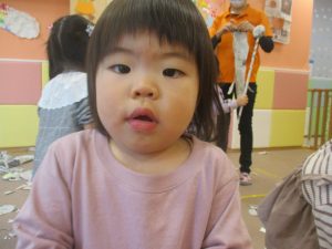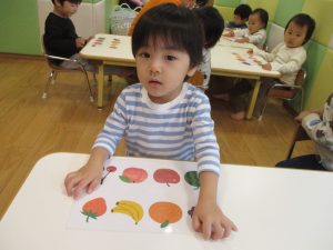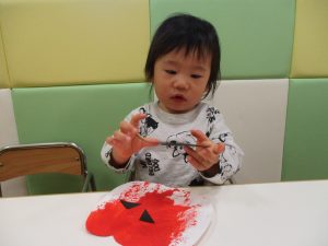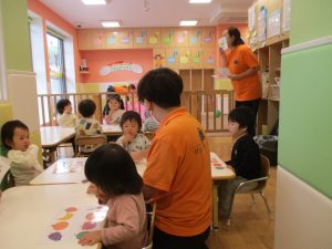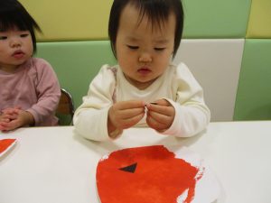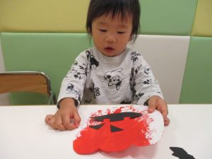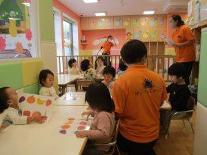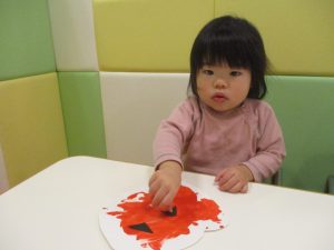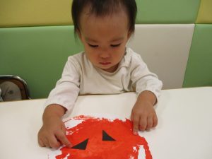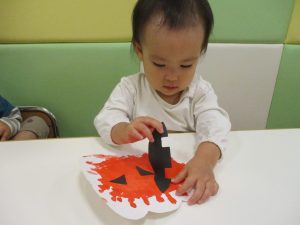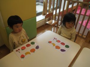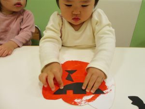 1歳児クラスのお友達は10月の製作の続きを行いました。