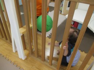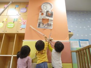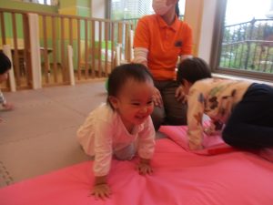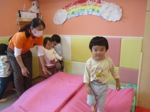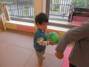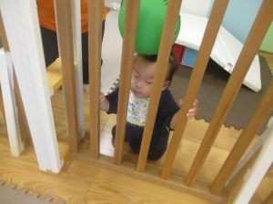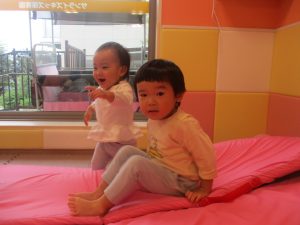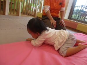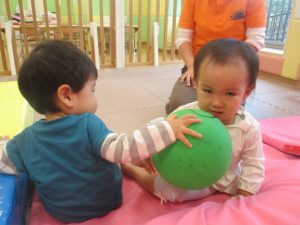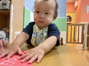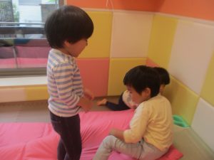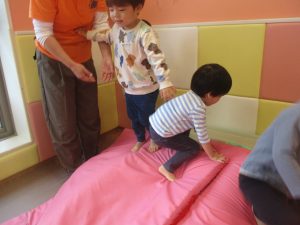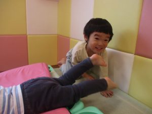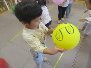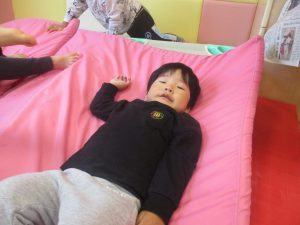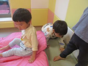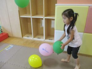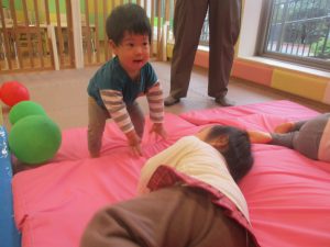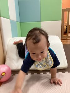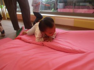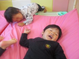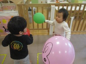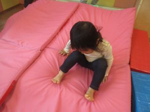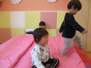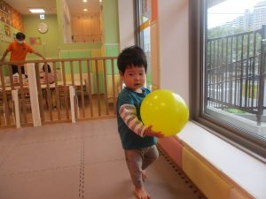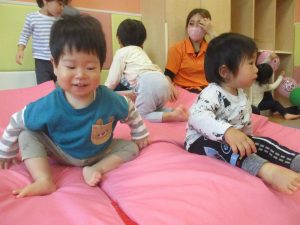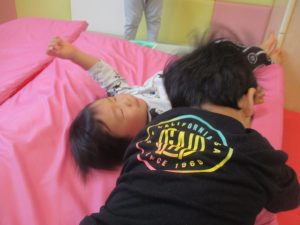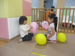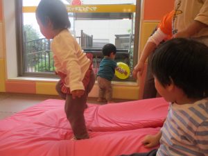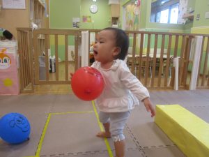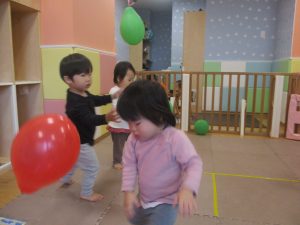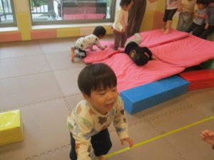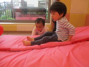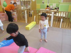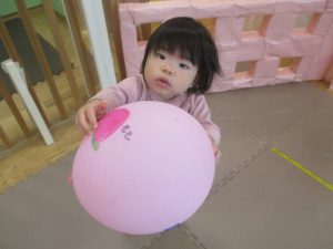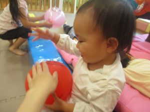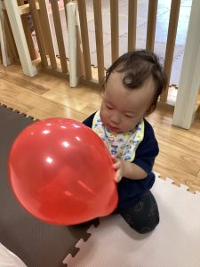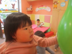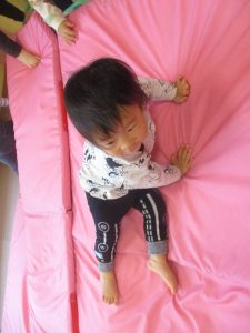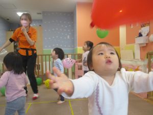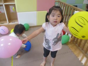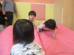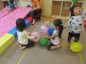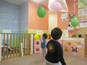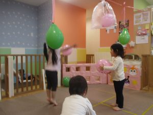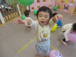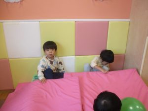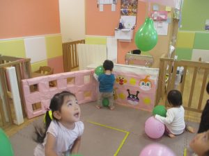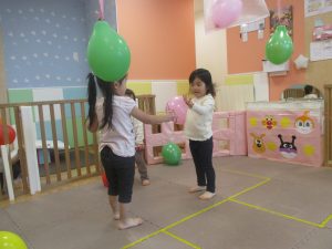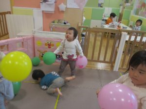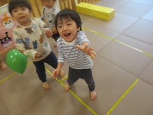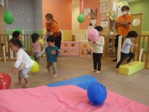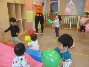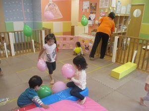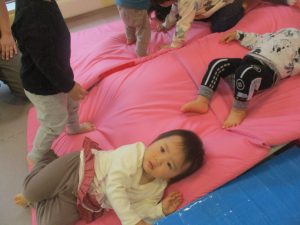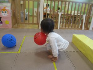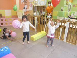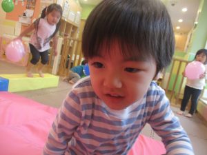 マットの滑り台でコロコロと転がったり吊るし風船にジャンプをしてタッチをしたり等、みんなで賑やかに過ごしておりました。