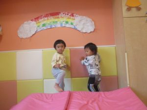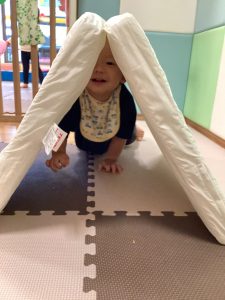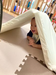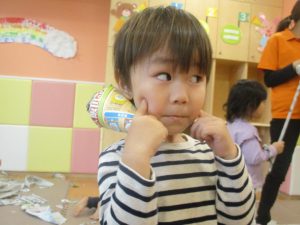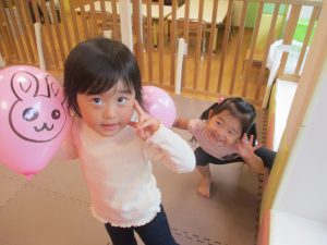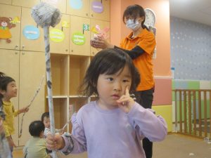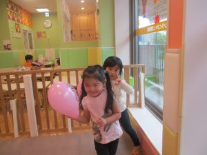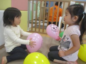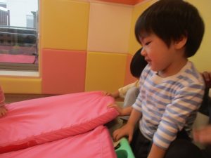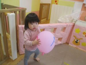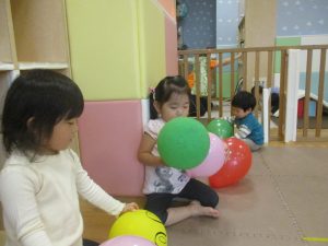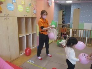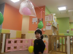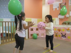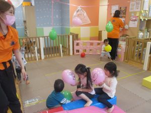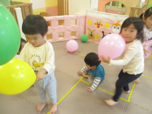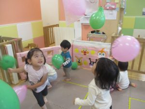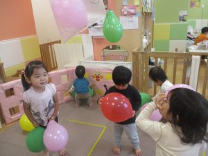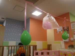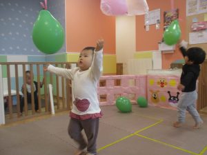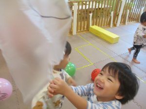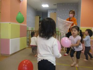 製作の後は、1、2歳児クラスのお友達と同様に、風船やお布団を使った遊びを楽しんでおりました。