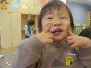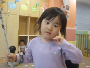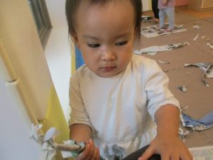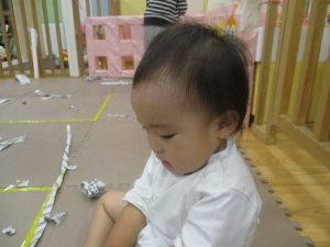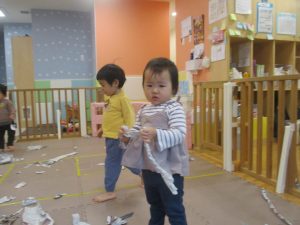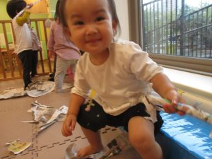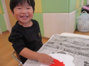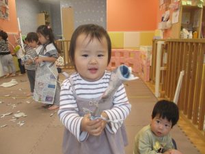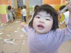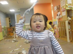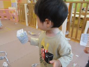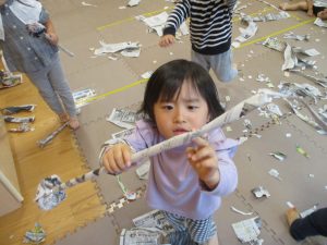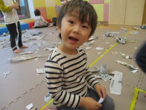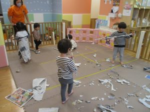 日中は室内にて新聞紙遊びを行いました。
