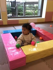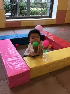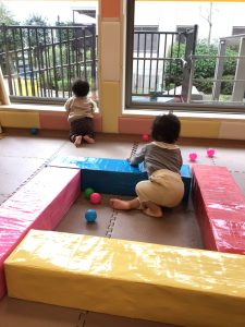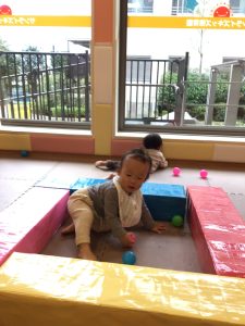 0歳児クラスのお友達は、広々としたお部屋をのびのびと使って、ボールプールで遊んでおりました。