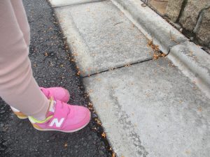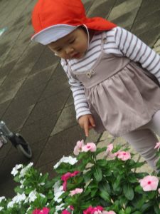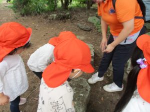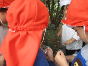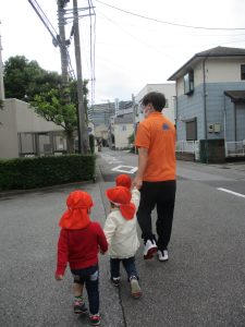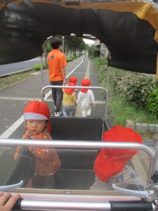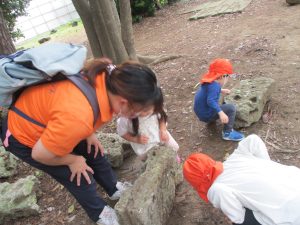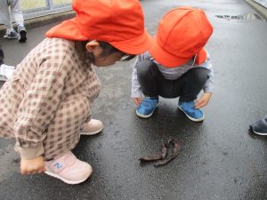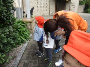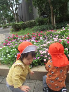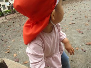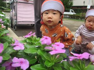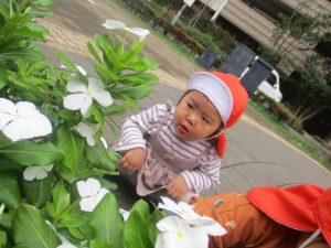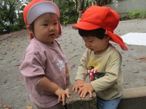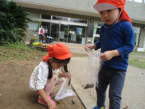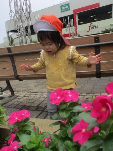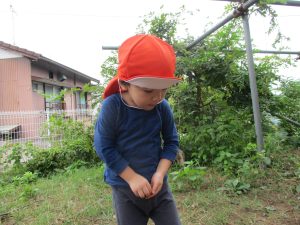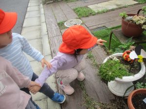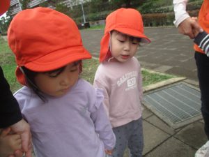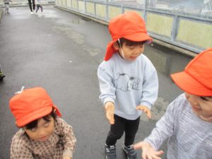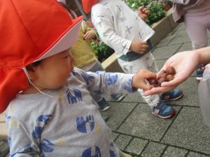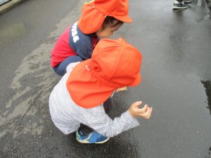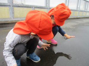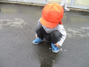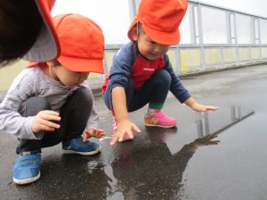 昨晩の雨であちこちに水たまりができていましたが「お魚いるかな~?」と覗き込んだり、水にニコニコ笑顔を写したりして可愛らしいお子様たちでした。