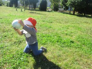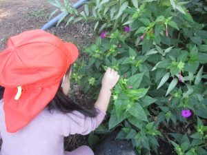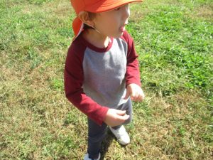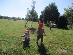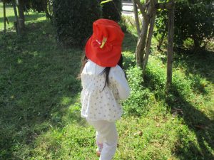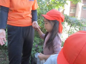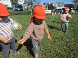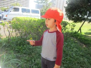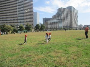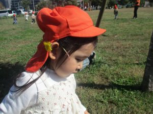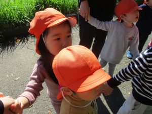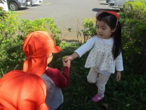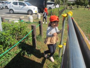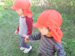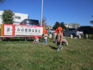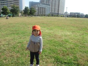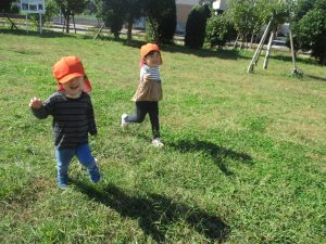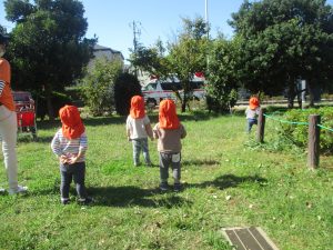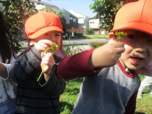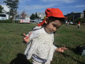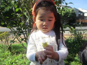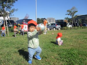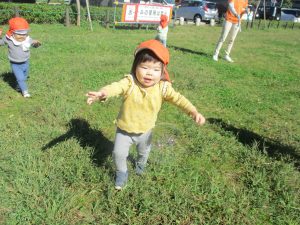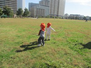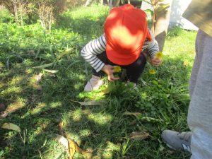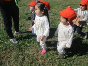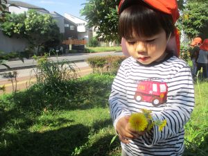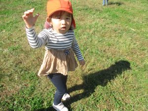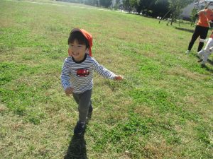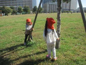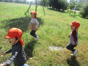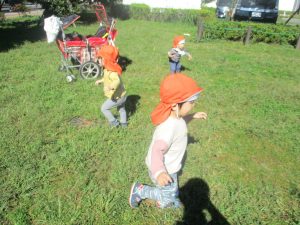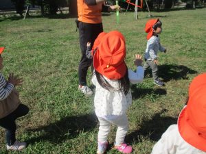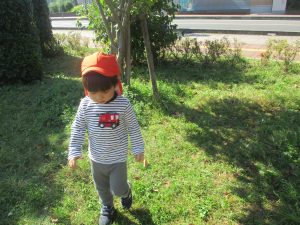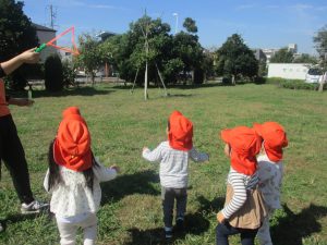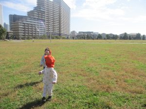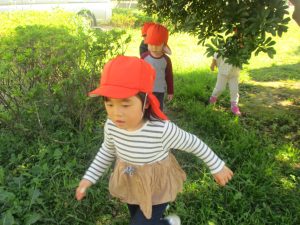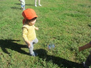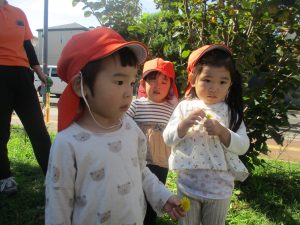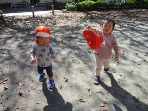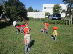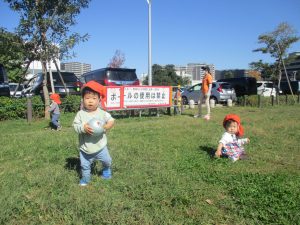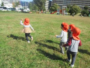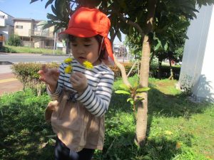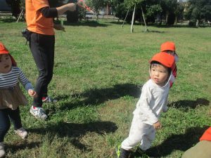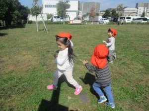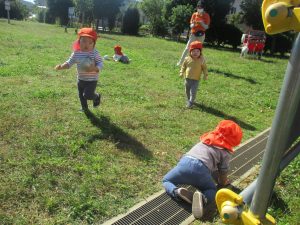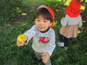 本日も気持ちの良い秋晴れの中、2歳児クラスのお友達は防災公園にて鬼ごっこやお花摘みを楽しみました。