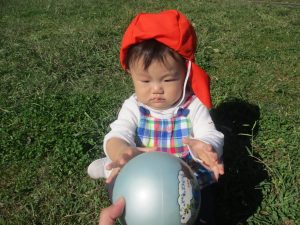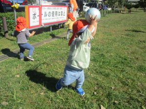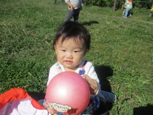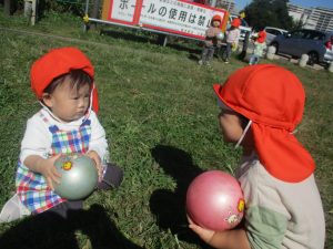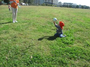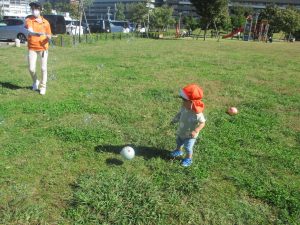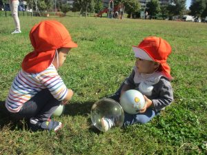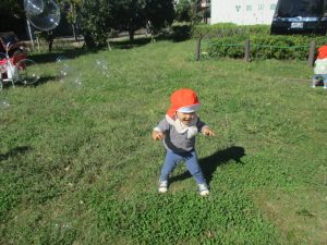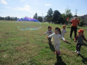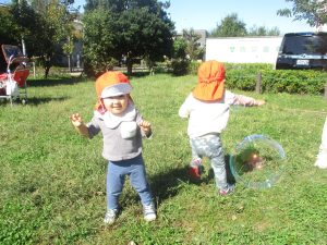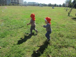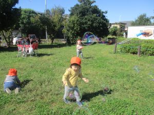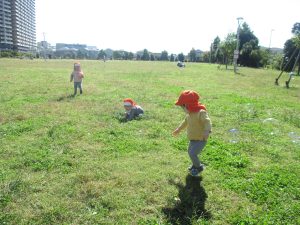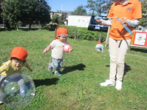 ぽかぽかと気持ちの良い芝生の上で、シャボン玉やボール遊びを思いきり楽しんでおりました♪