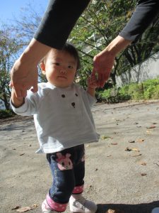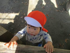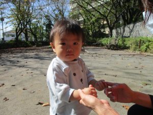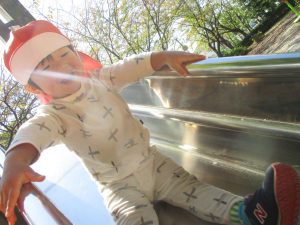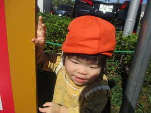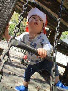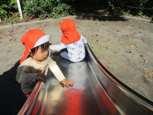 秋色に染まった落ち葉の散る中、先生と一緒に「あんよがじょうず~♪」と歩くことを楽しんだり「よいしょっよいしょっ♪」と大きな滑り台に挑戦したりして遊んでおりました♡