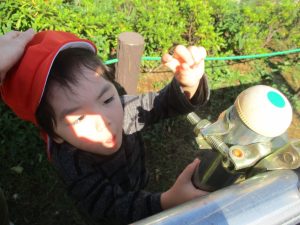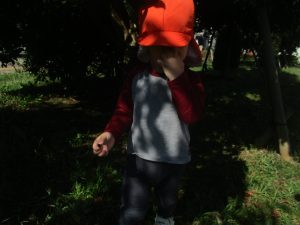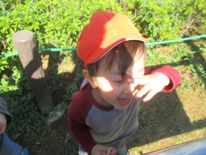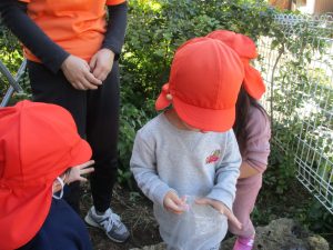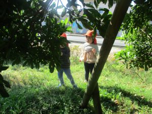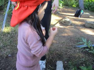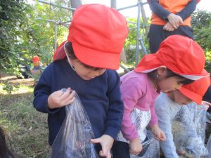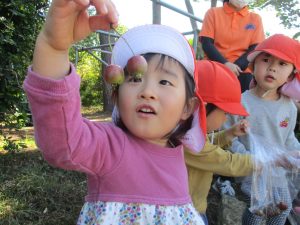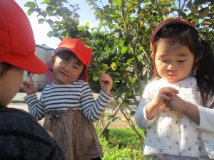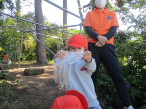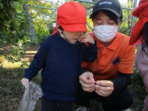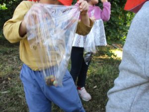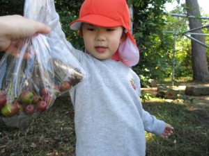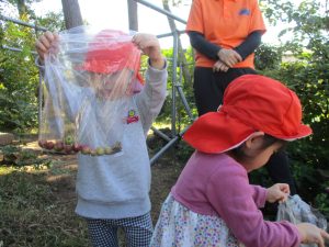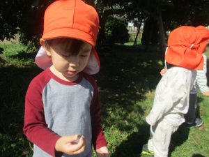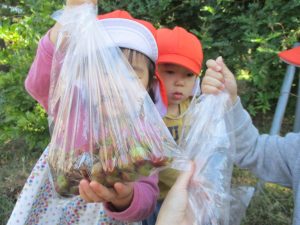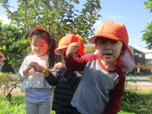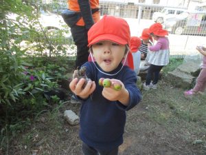 「柿がたくさんなってるねー!」と果物を発見したり「姫リンゴ、さくらんぼみたいだね♡」や「松ぼっくりいっぱい!こっちにしよう!」と秋の収穫物をお土産に拾ったりして過ごしました♪