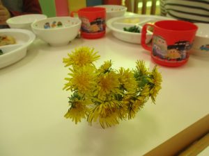 お散歩中に摘んだタンポポのお花、「お水飲んだら元気になるよね♡」と、保育園に帰ってからみんなでお水に生けてあげました♪