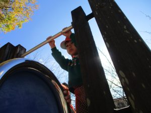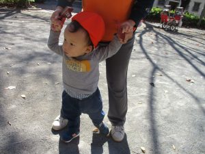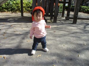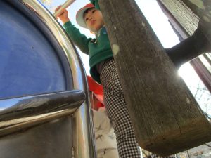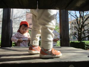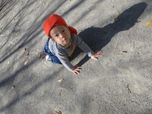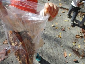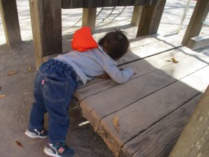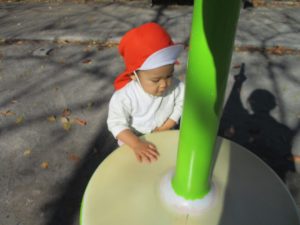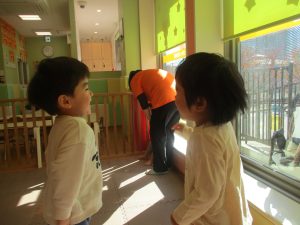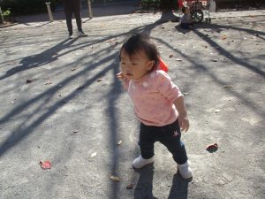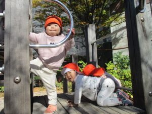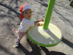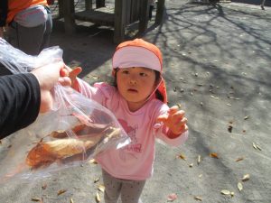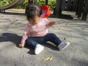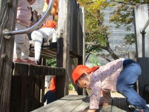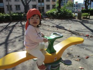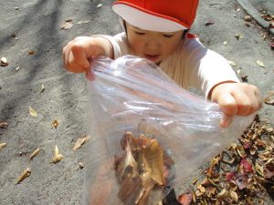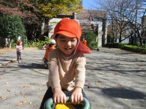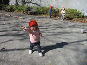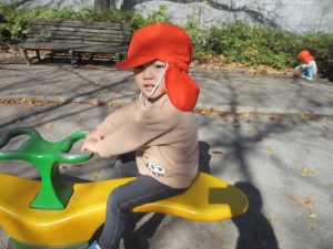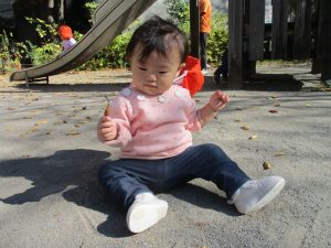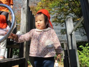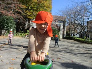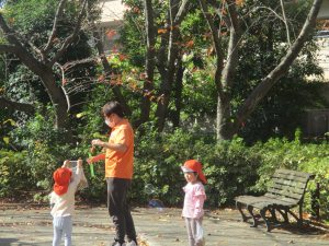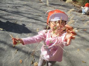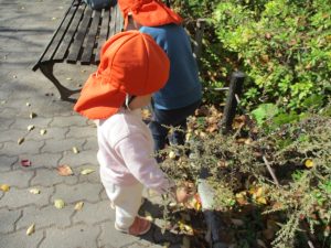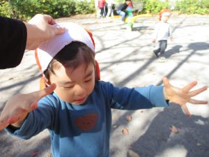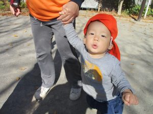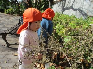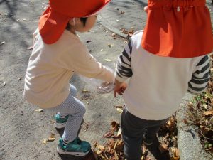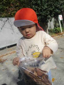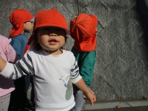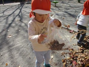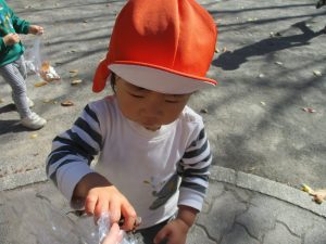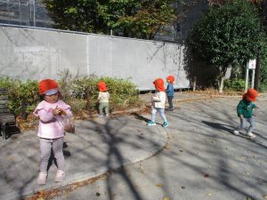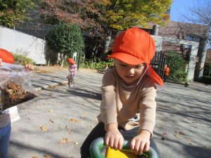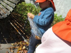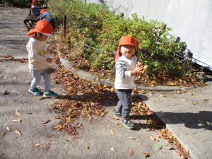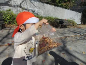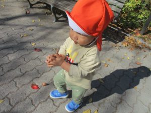 戸外にはいろいろな色や大きさの落ち葉がたくさん落ちていて「先生のお顔より大きな葉っぱだよ♪」とお顔と大きさ比べをしたり、上を見上げて「わぁ、葉っぱ、なくなっちゃったね~」と自然の変化を楽しんだりしておりました。