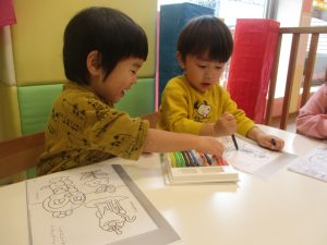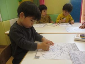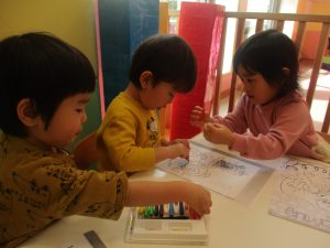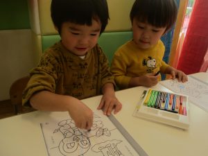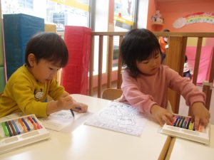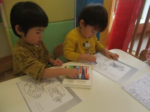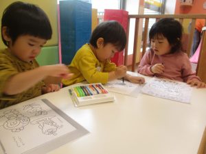 2歳児クラスのお友達は、ぬりえ遊びにも集中して取り組んでおりました。