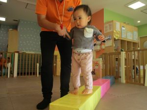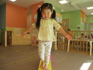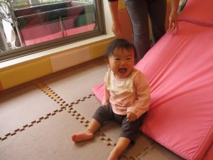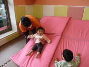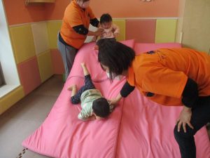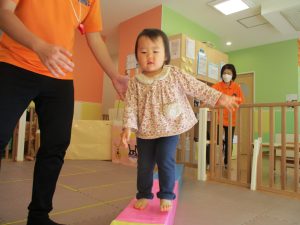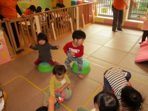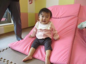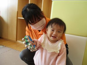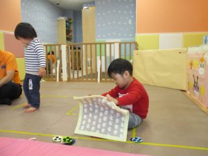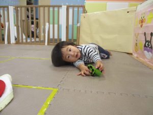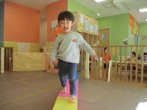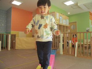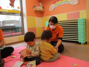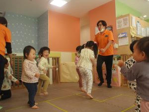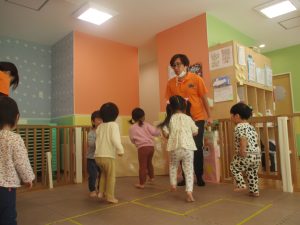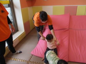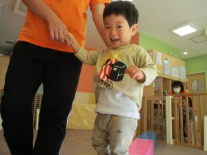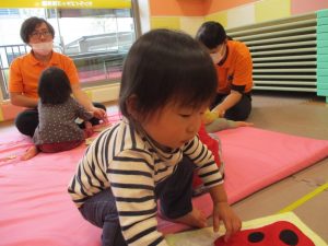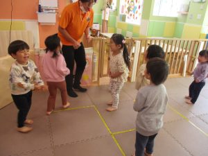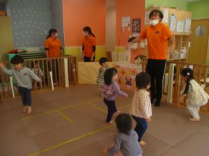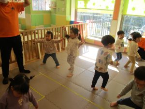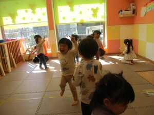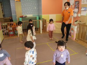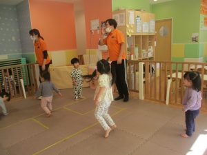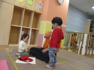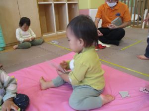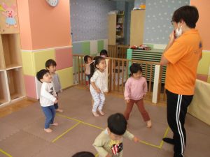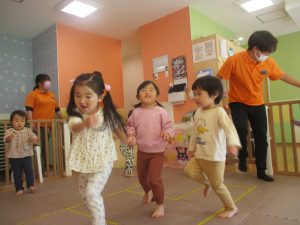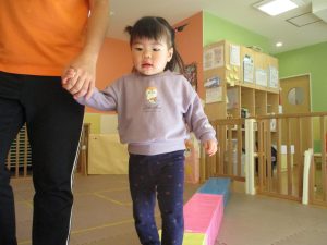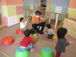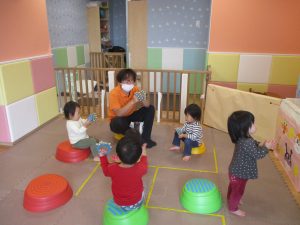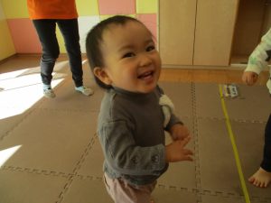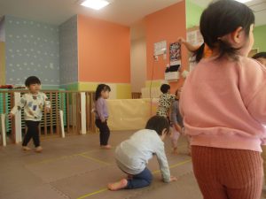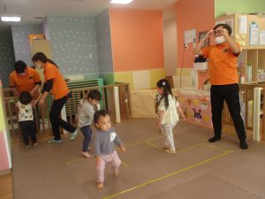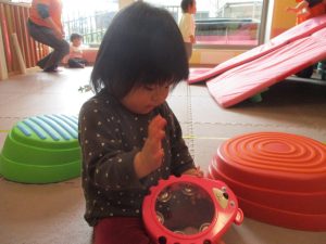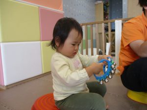お部屋にミニサーキットを作って体を動かしたり、タンバリンや鈴などの楽器に触れて音を鳴らしたりして遊んでおりました。