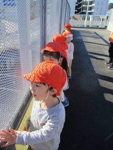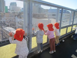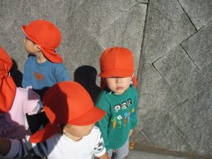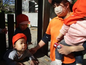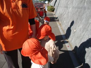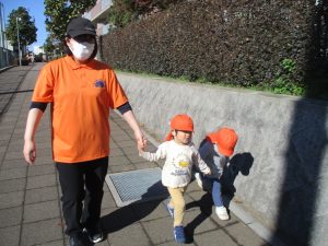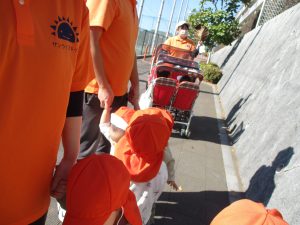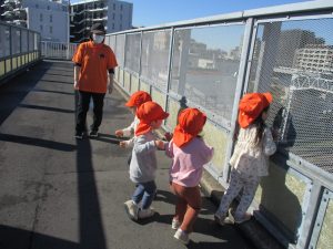朝方の体操を楽しんだ後は年齢別で戸外散歩を行いました。