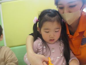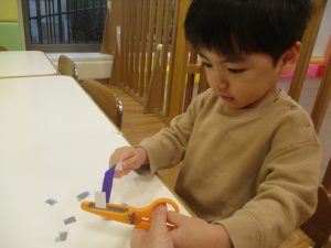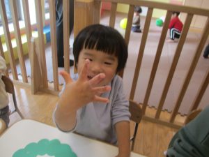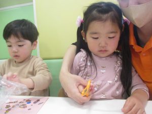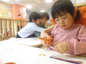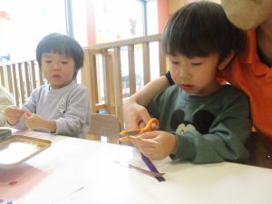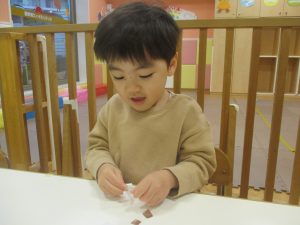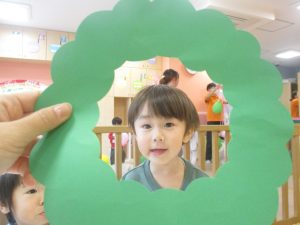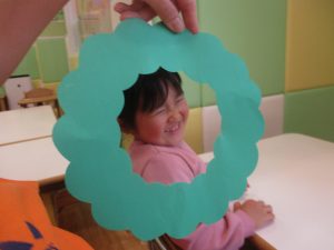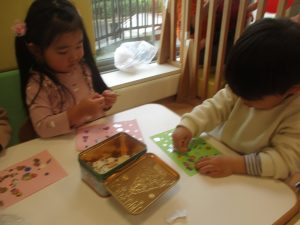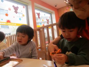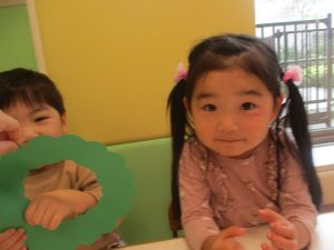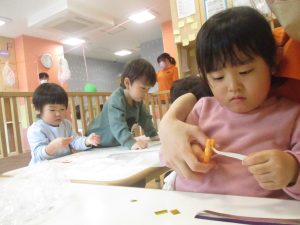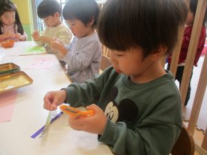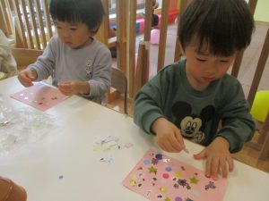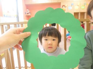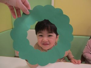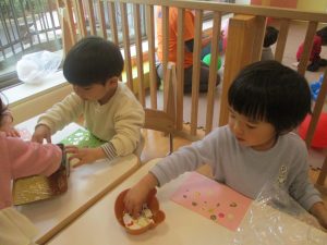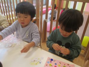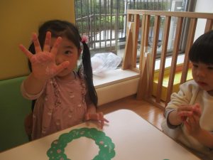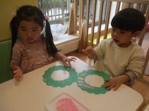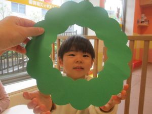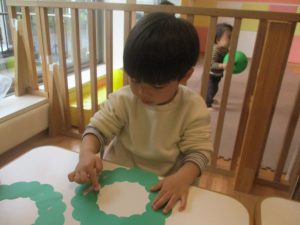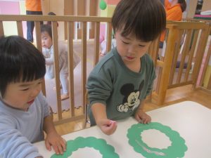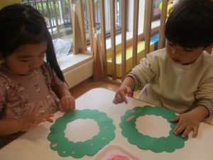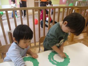 リトミックの後、2歳児クラスのお友達は12月の製作を行いました。