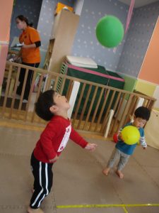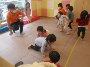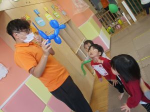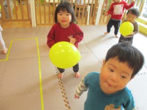 先生やお友達と一緒に風船の感触を楽しんだり、飛ばしたりして元気に体を動かして遊んでおりました♪