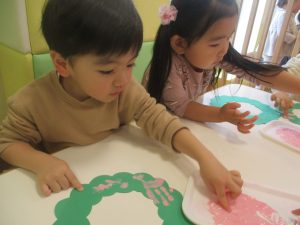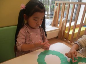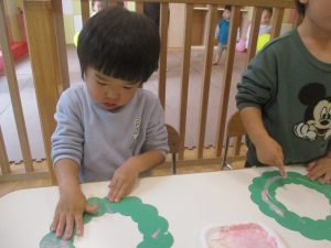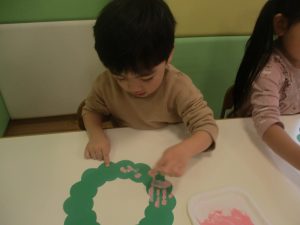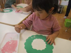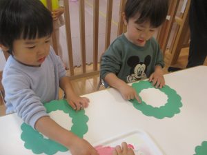 赤色と白色の絵の具を使って、一人ひとつずつのリースに綺麗な模様を描いていきました♪
