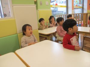 おつきさまが「こんばんは」とお顔を出してから、雲に隠れたり、再び出てきて笑顔を見せたり、そんなおつきさまの表情に合わせてお子様たちも可愛く表情を作りながら見ています♪