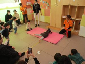 体操を皆の前で1人ずつ披露する際に、恥ずかしがるお子様に対して皆で駆け寄り励ます姿、、、グッとくるものがございました。