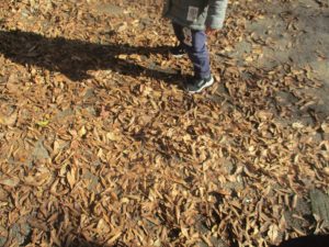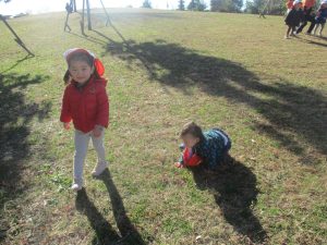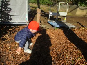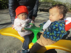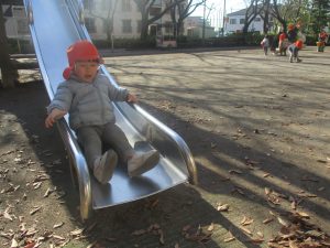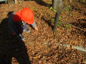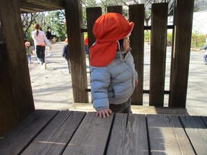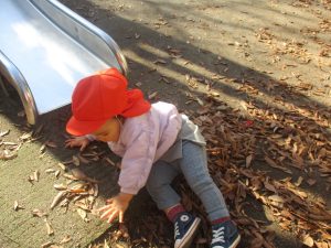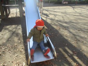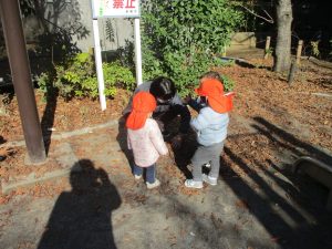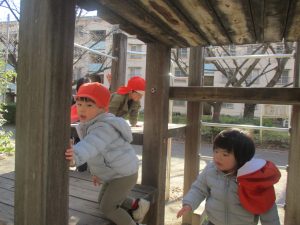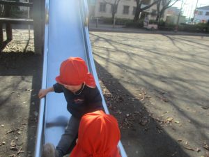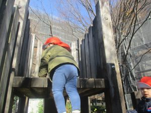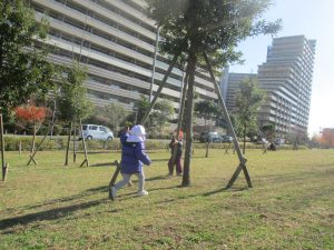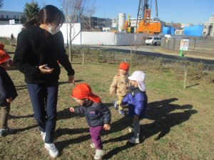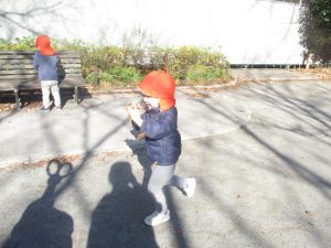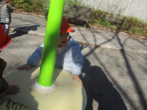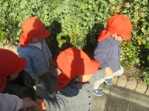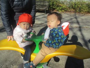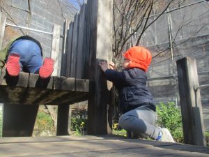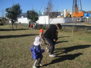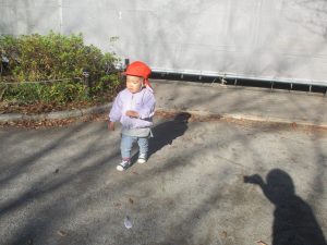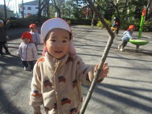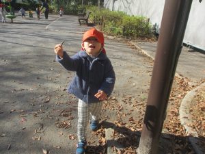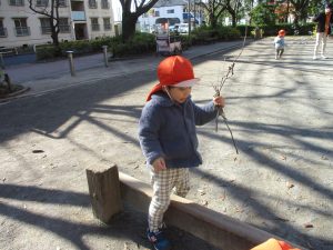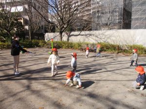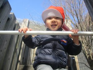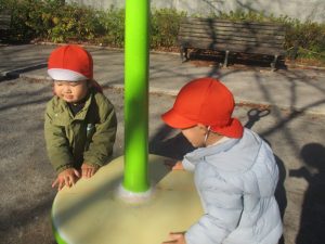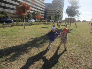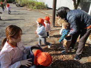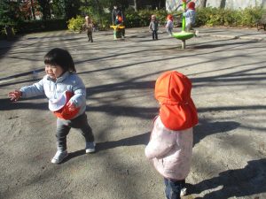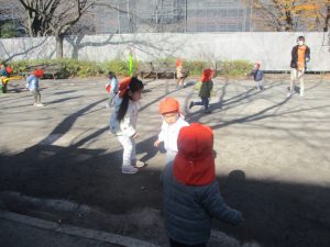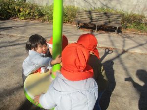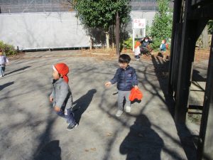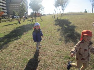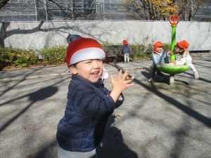 冬支度が整った木々の落ち葉を拾い集めては楽しそうに落ち葉吹雪を行ったり、固定遊具を使用してたくさん体を動かしました。