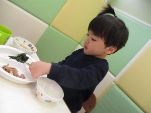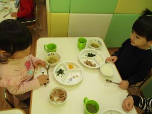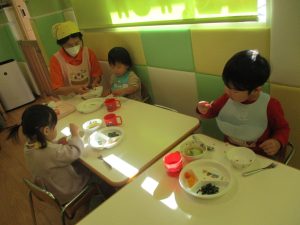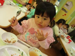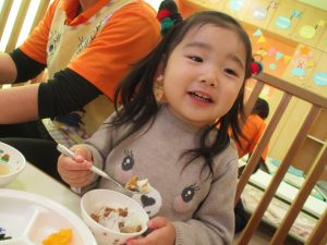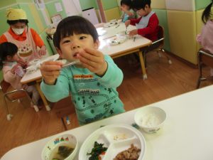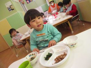 降園後は大好きな谷津園給食♪この日は「豚肉のマーマレード焼き」でしたが、こちらが本当に大人気のメニューであっという間におかわりまでなくなります!