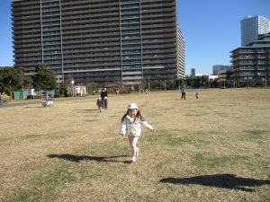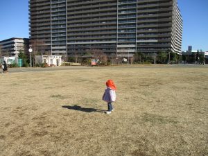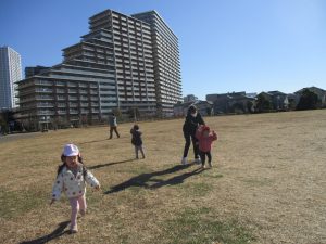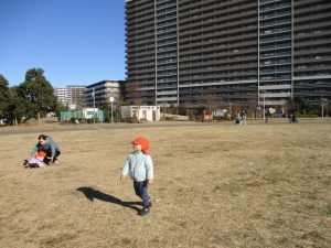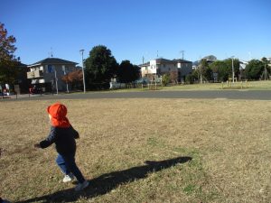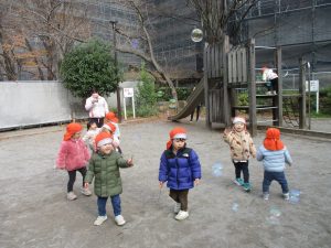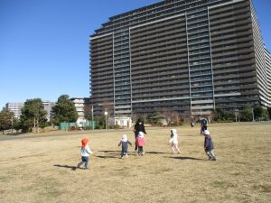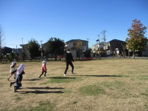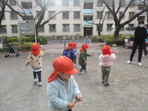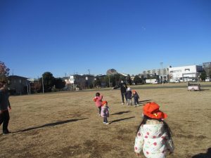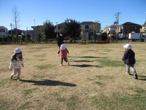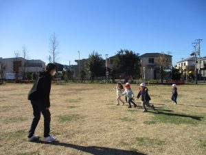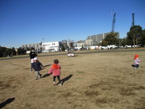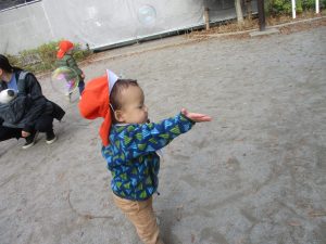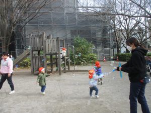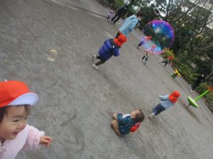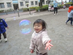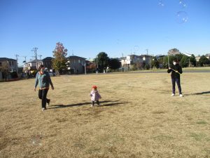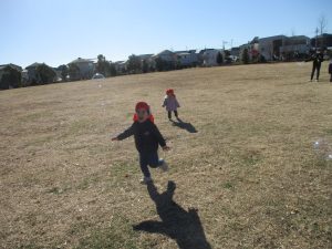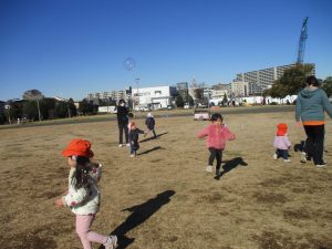 2歳児クラスのお友達は防災公園にて過ごしました!広場での追いかけっこや、シャボン玉を追いかけて思い切り体を動かして遊びました。