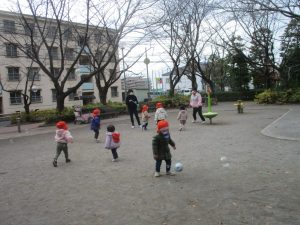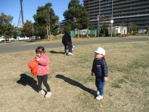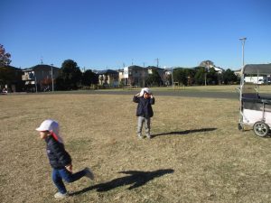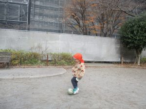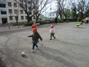 「戸外で思い切り身体を動かす」が今月のねらいとなっておりますので、ボールを持参して投げる・蹴る・追いかける等の動きを楽しみました!