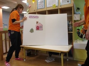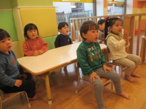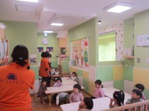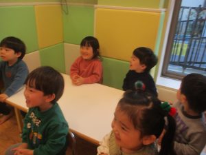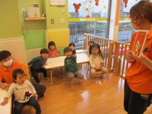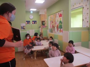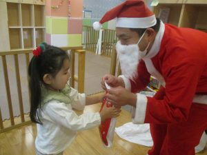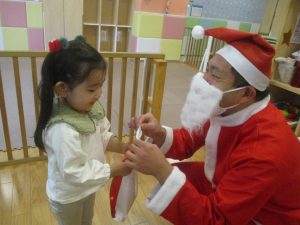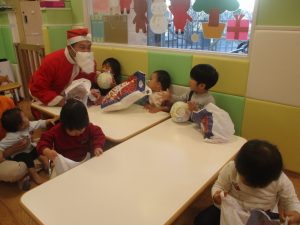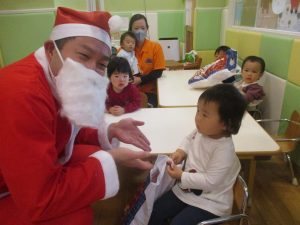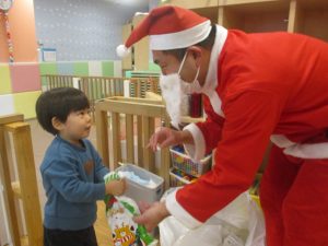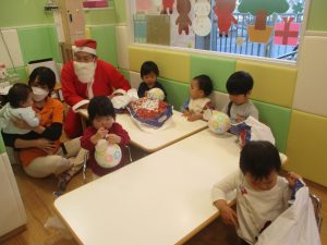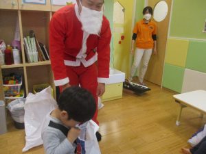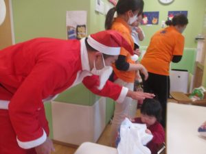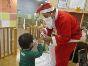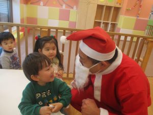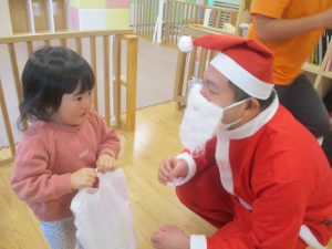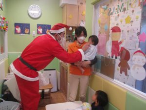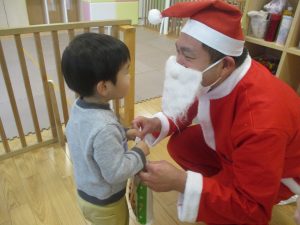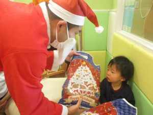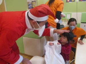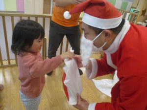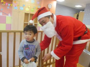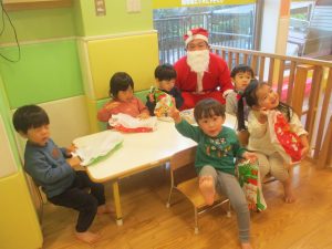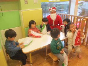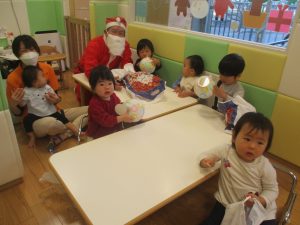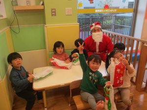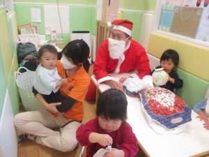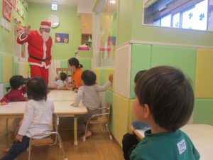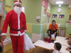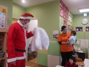 クリスマスにちなんだ絵本の読み聞かせやペープサートを皆で楽しんでいると、、、サプライズでサンタさんが来てくれました!!!