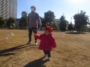 防災公園にてシャボン玉を追いかけたり、自然物探しを楽しみこの時期ならではの戸外遊びとなりました。