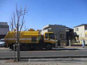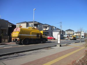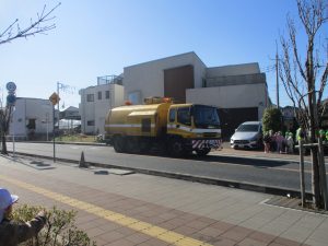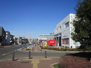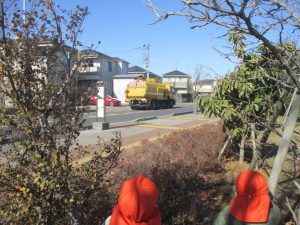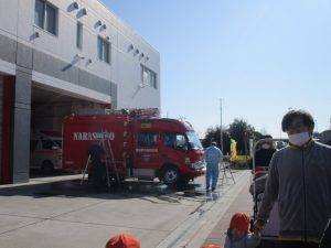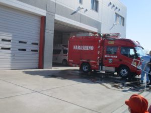 帰園の際に園周辺の消防署の前を通ると、かっこいい消防車が道路前に出てきており皆で見学をさせて頂きました。