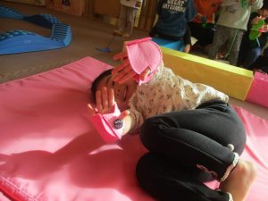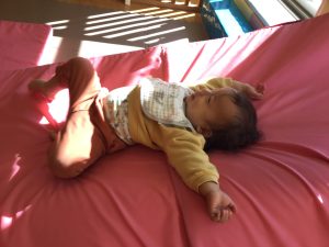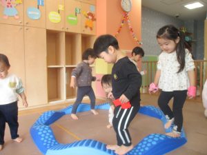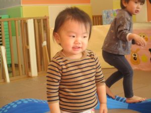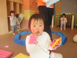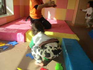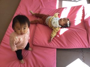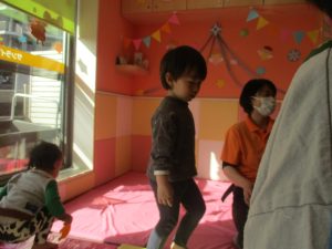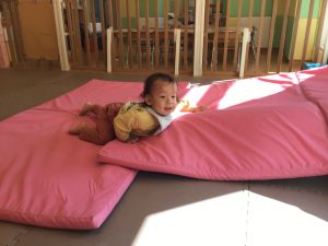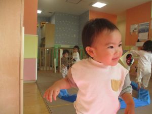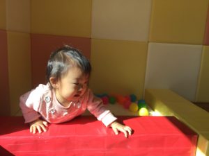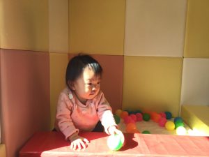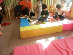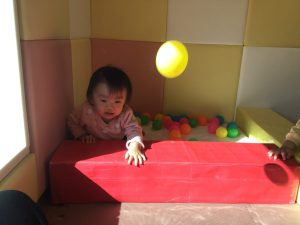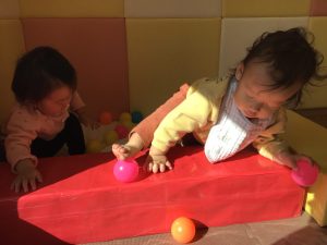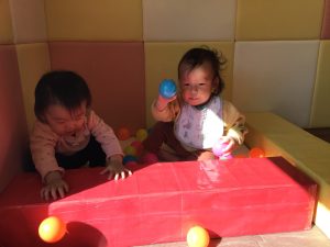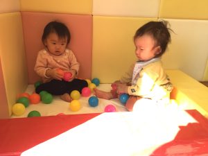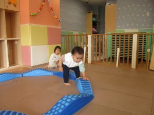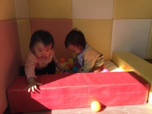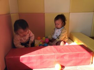 広い保育室を使用して、ボールプールやマット遊びを存分に楽しみました。