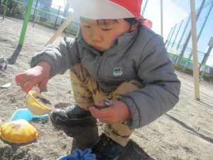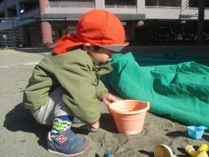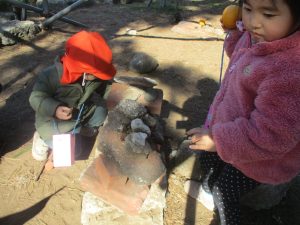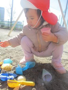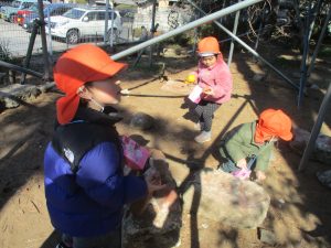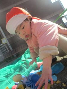 固定遊具で体を動かしたり、砂場でのままごと遊びに夢中でした!