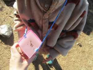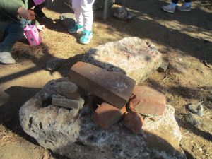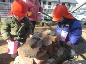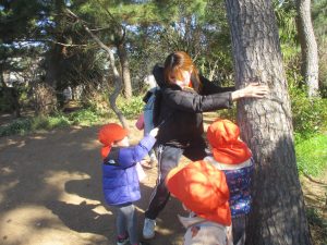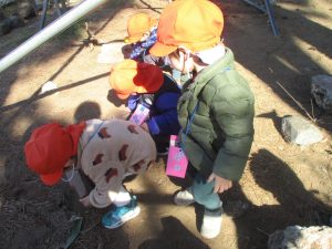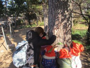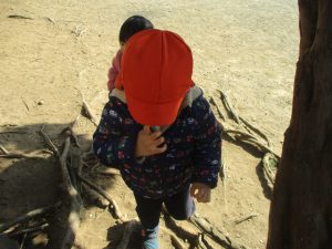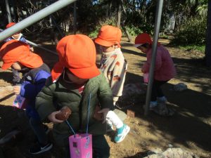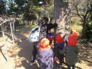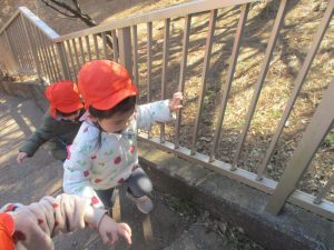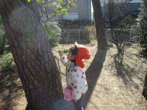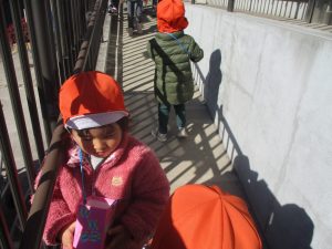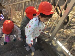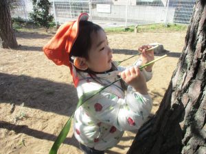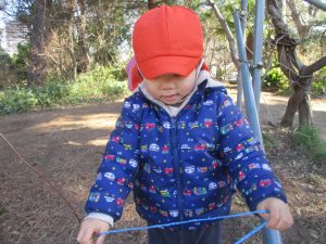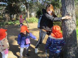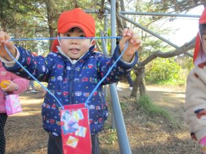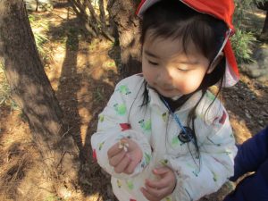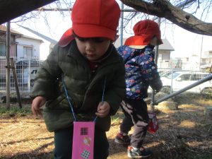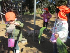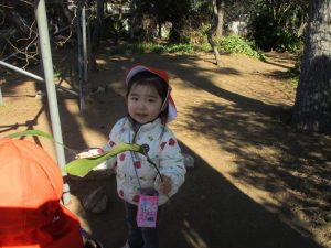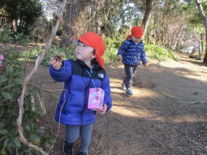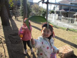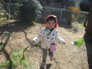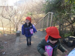 2歳児クラスのお友達は手作りの散歩バッグを肩にかけ、谷津コミュの奥の林まで遊びに行きました。